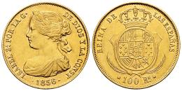 Elizabeth II (1833-1868). 100 reales. 1856. Barcelona. (Cal-766). Au. 8,35 g. Traces of luster. Very scarce in this grade. XF. Est...750,00.