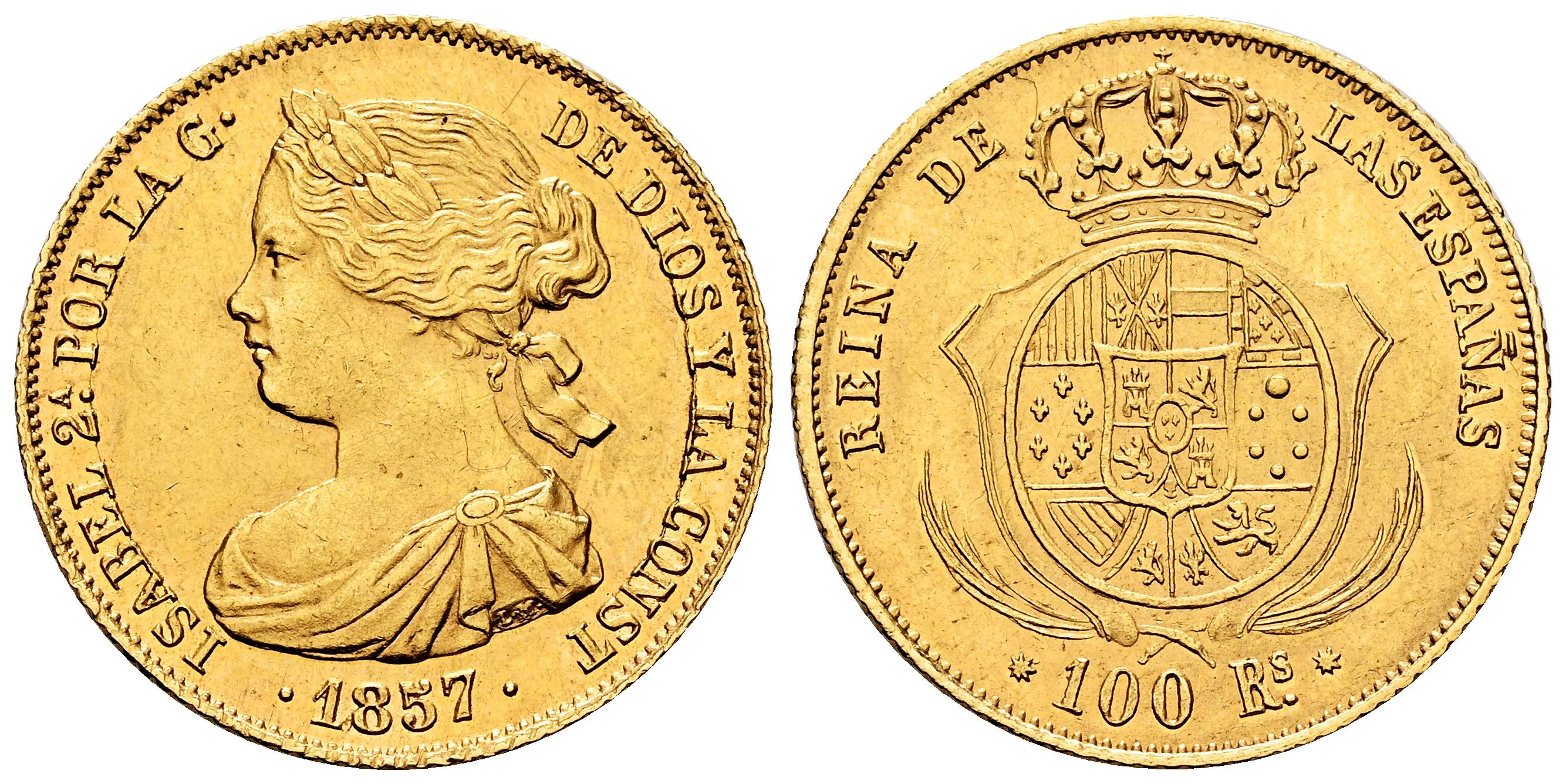 Elizabeth II (1833-1868). 100 reales. 1857. Barcelona. (Cal-767). Au. 8,44 g. Original luster. XF. Est...700,00.
