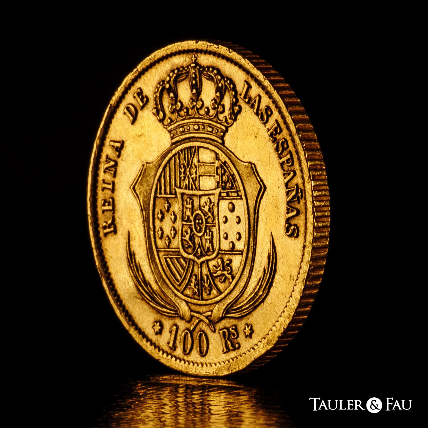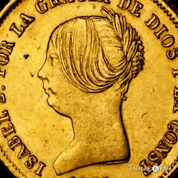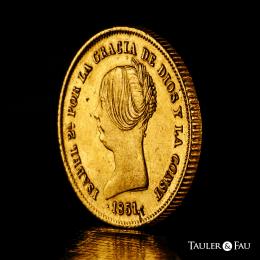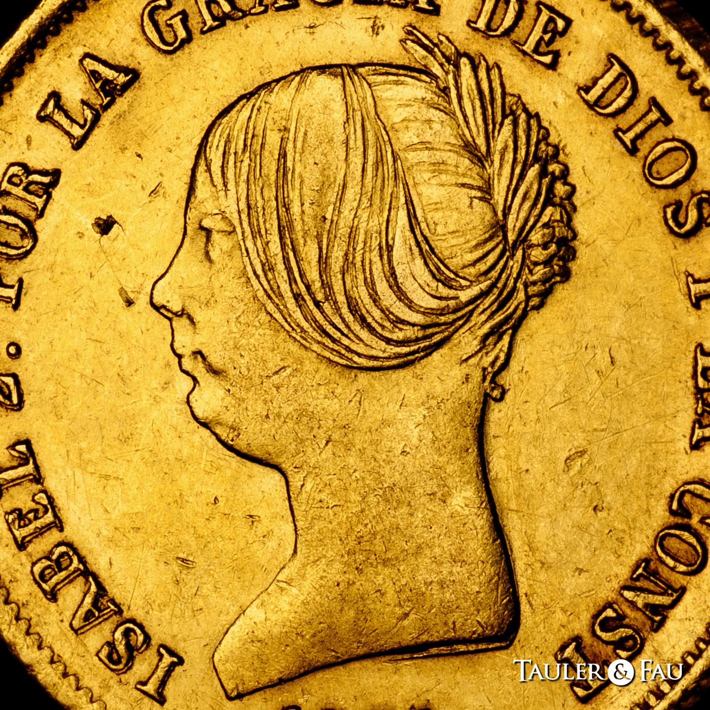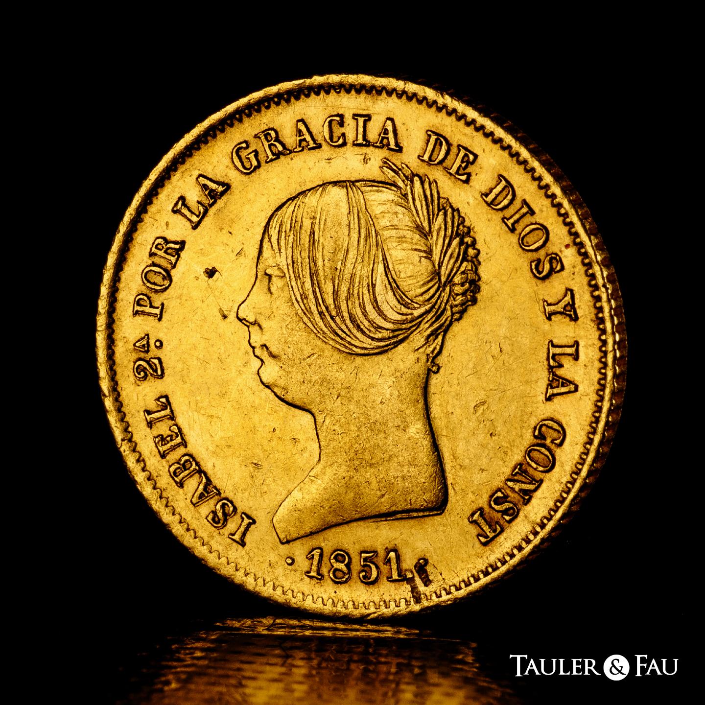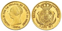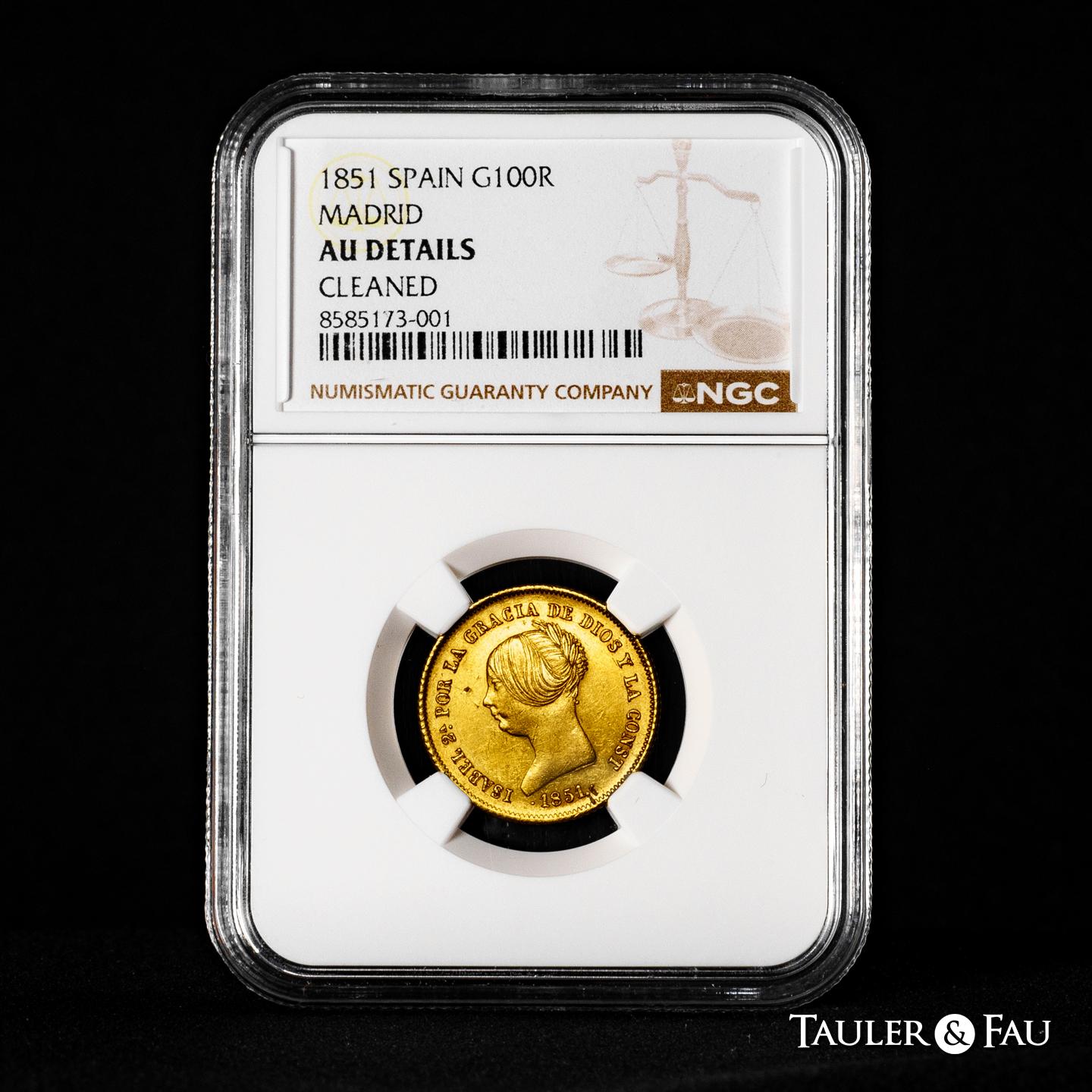 Elizabeth II (1833-1868). 100 reales. 1851. Madrid. (Cal-777). Au. 8,23 g. Two knocks on the edge and two minimal planchet flaw on the obverse. Missing in most specialised collections. Extremely rare. Slabbed by NGC as AU Details, Cleaned. Almost XF/XF. Est...5000,00.