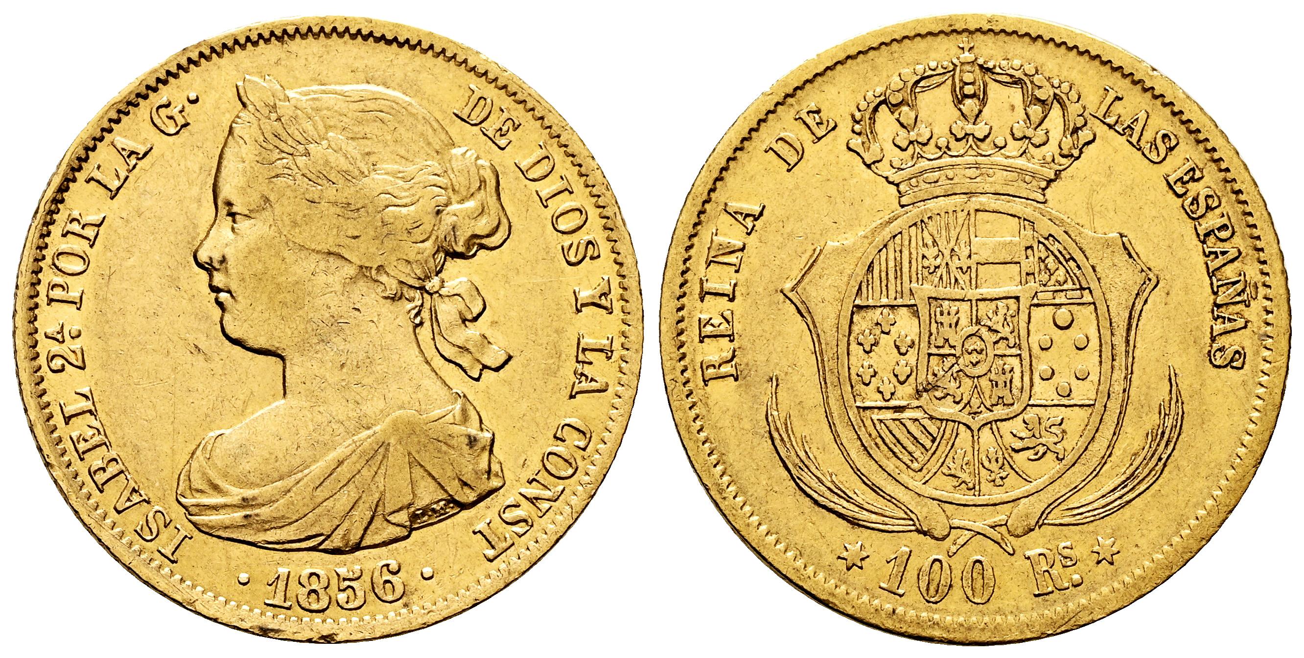 Elizabeth II (1833-1868). 100 reales. 1856. Madrid. (Cal-783). Au. 8,37 g. VF/Choice VF. Est...650,00.