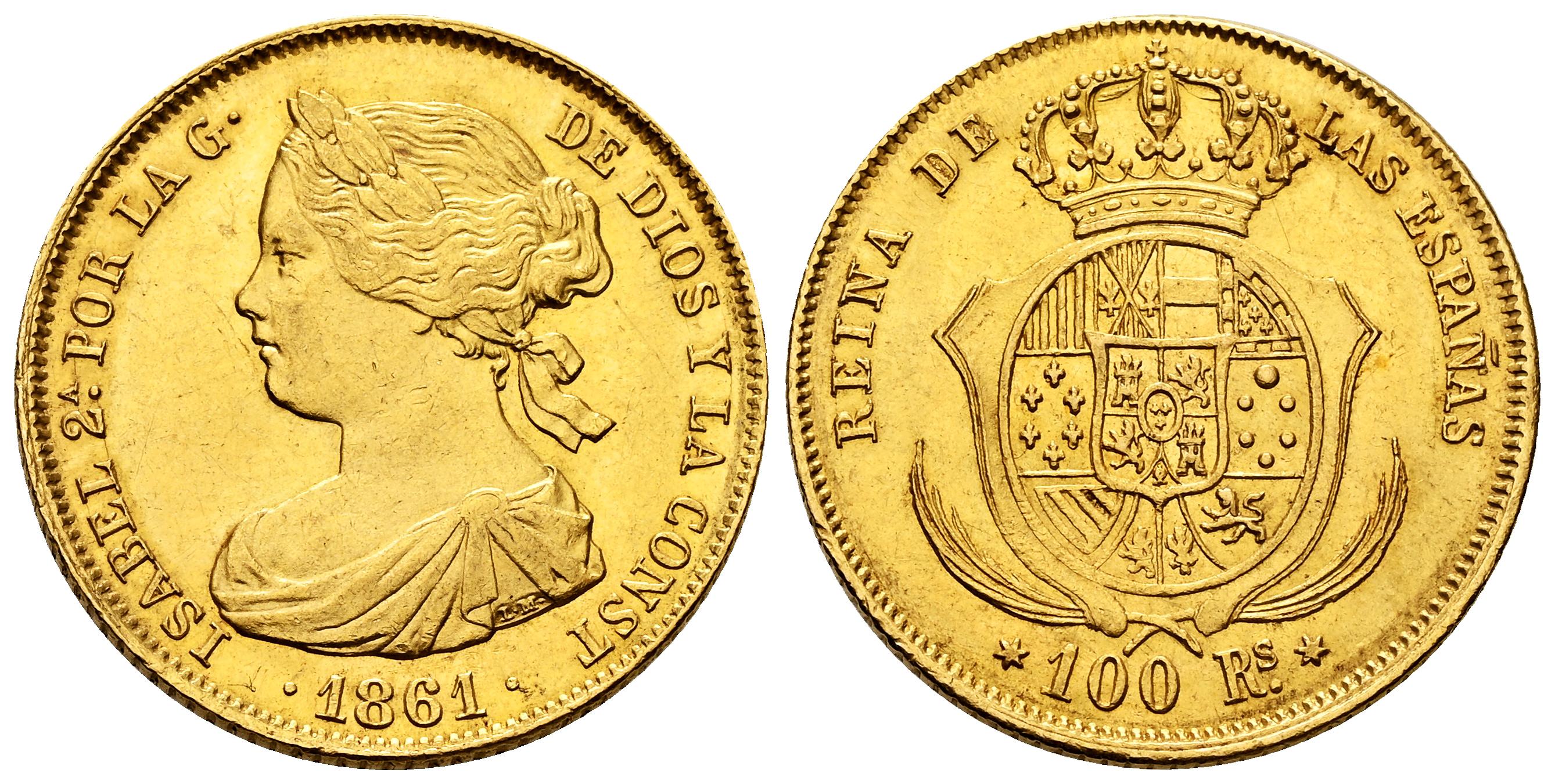 Elizabeth II (1833-1868). 100 reales. 1861. Madrid. (Cal-788). Au. 8,40 g. Traces of luster. AU. Est...700,00.