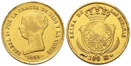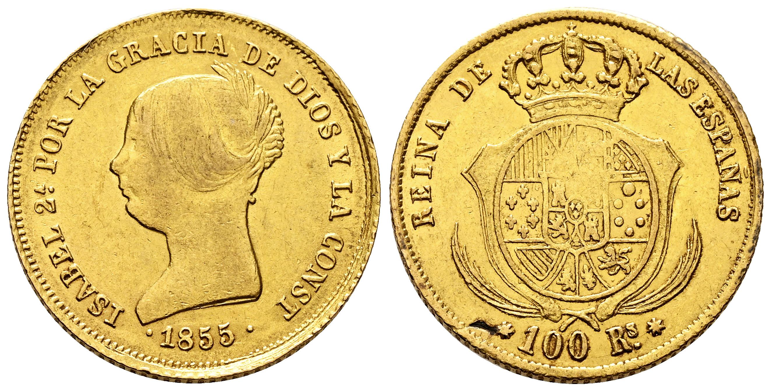 Elizabeth II (1833-1868). 100 reales. 1855. Sevilla. (Cal-796). Au. 8,35 g. Small planchet flaw on reverse. Choice VF. Est...650,00.
