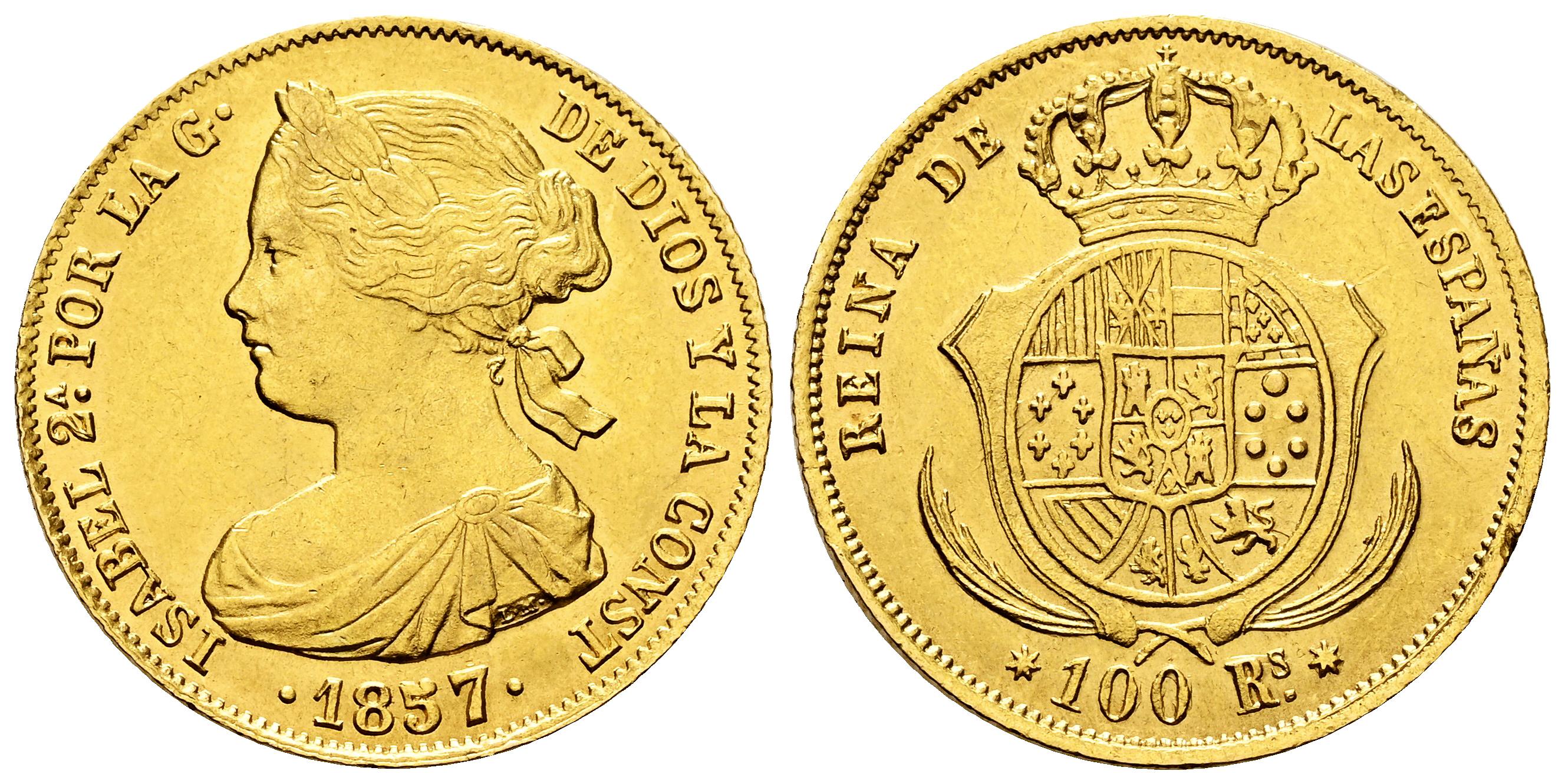 Elizabeth II (1833-1868). 100 reales. 1857. Sevilla. (Cal-798). Au. 8,36 g. Minor nick on the edge. Original luster. XF/AU. Est...700,00.