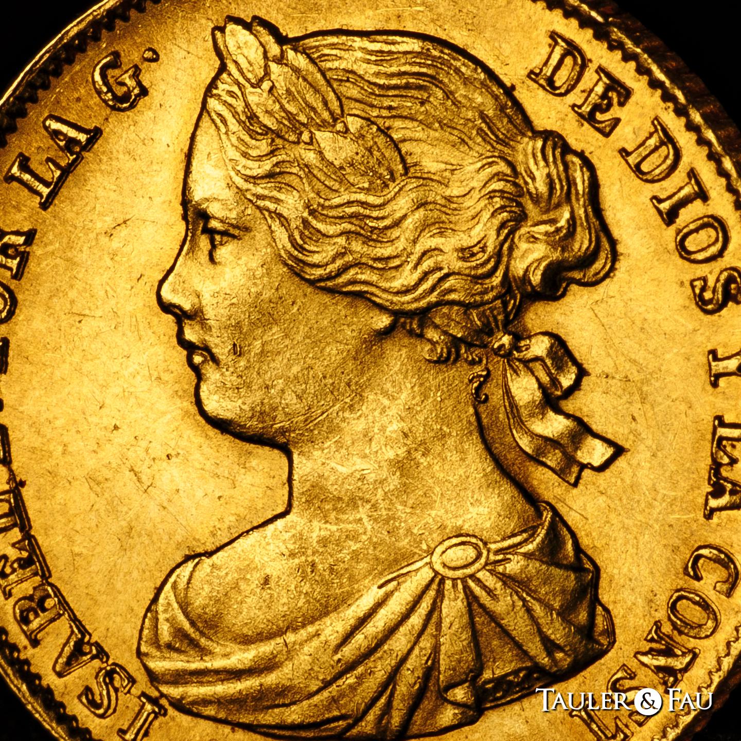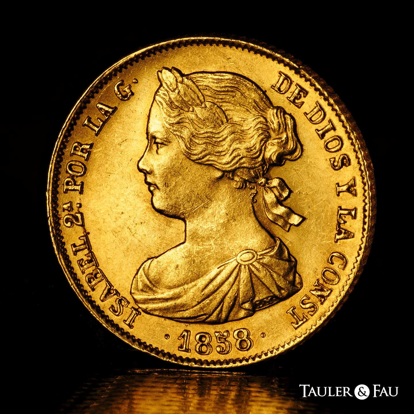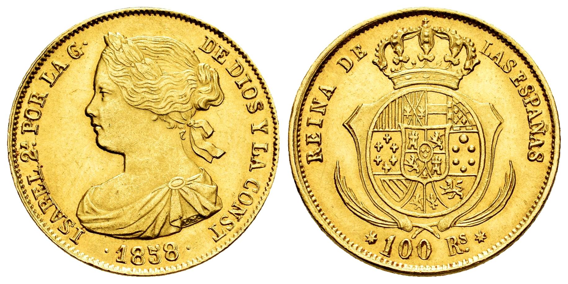 Elizabeth II (1833-1868). 100 reales. 1858. Sevilla. (Cal-799). Au. 8,34 g. Original luster. Magnificent piece. Slabbed by NGC as MS 63. (Top Pop), the finest known in the NGC census. Est...1000,00.