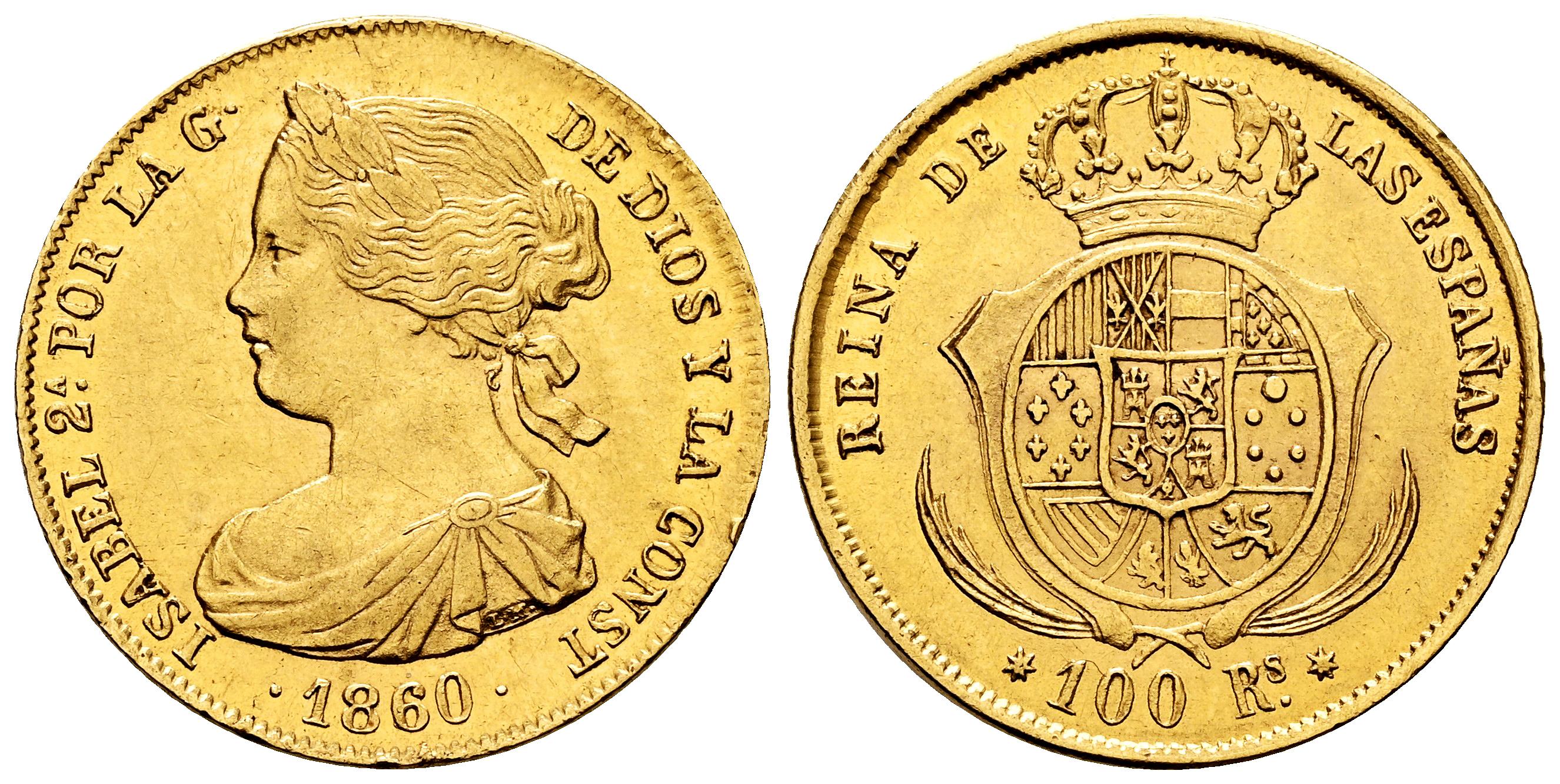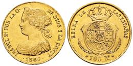 Elizabeth II (1833-1868). 100 reales. 1860/50. Sevilla. (Cal-801). Au. 8,36 g. Overdate. Minor nicks on edge. Traces of luster. Scarce. Almost XF. Est...700,00.