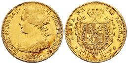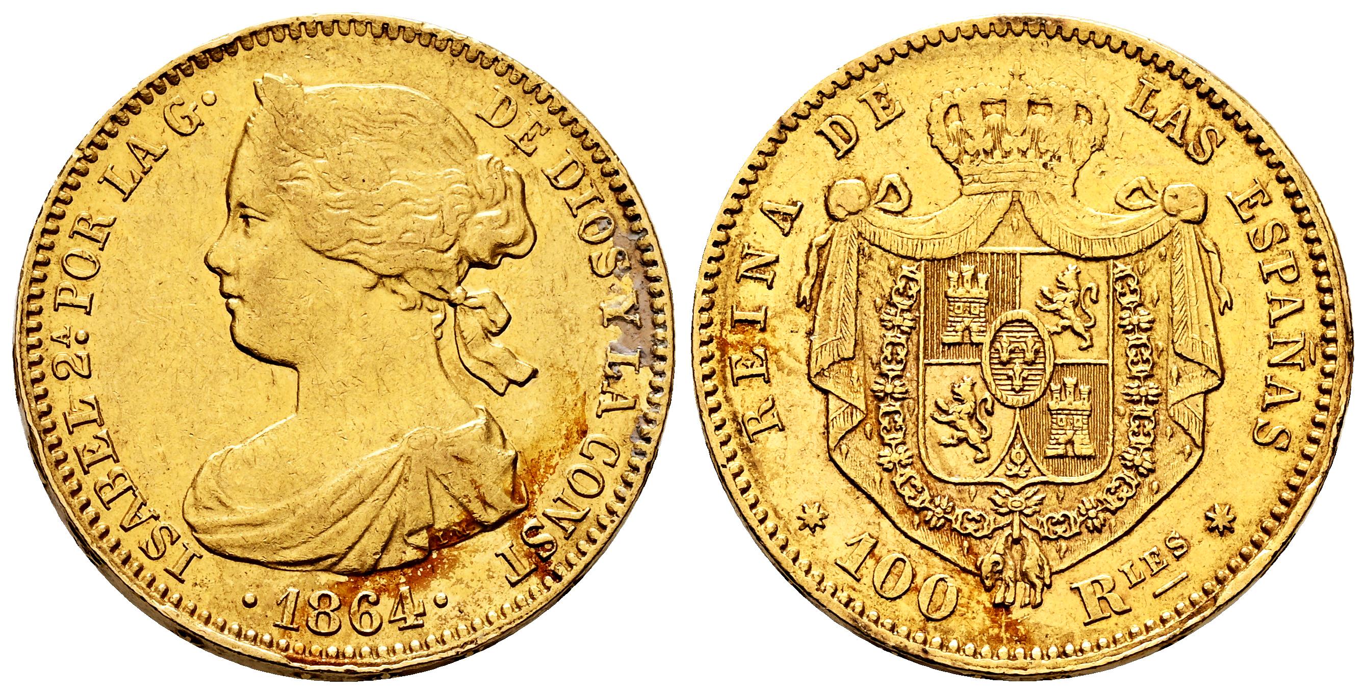 Elizabeth II (1833-1868). 100 reales. 1864. Sevilla. (Cal-807). Au. 8,36 g. Stains. Minor nicks on edge. Choice VF/Almost XF. Est...600,00.