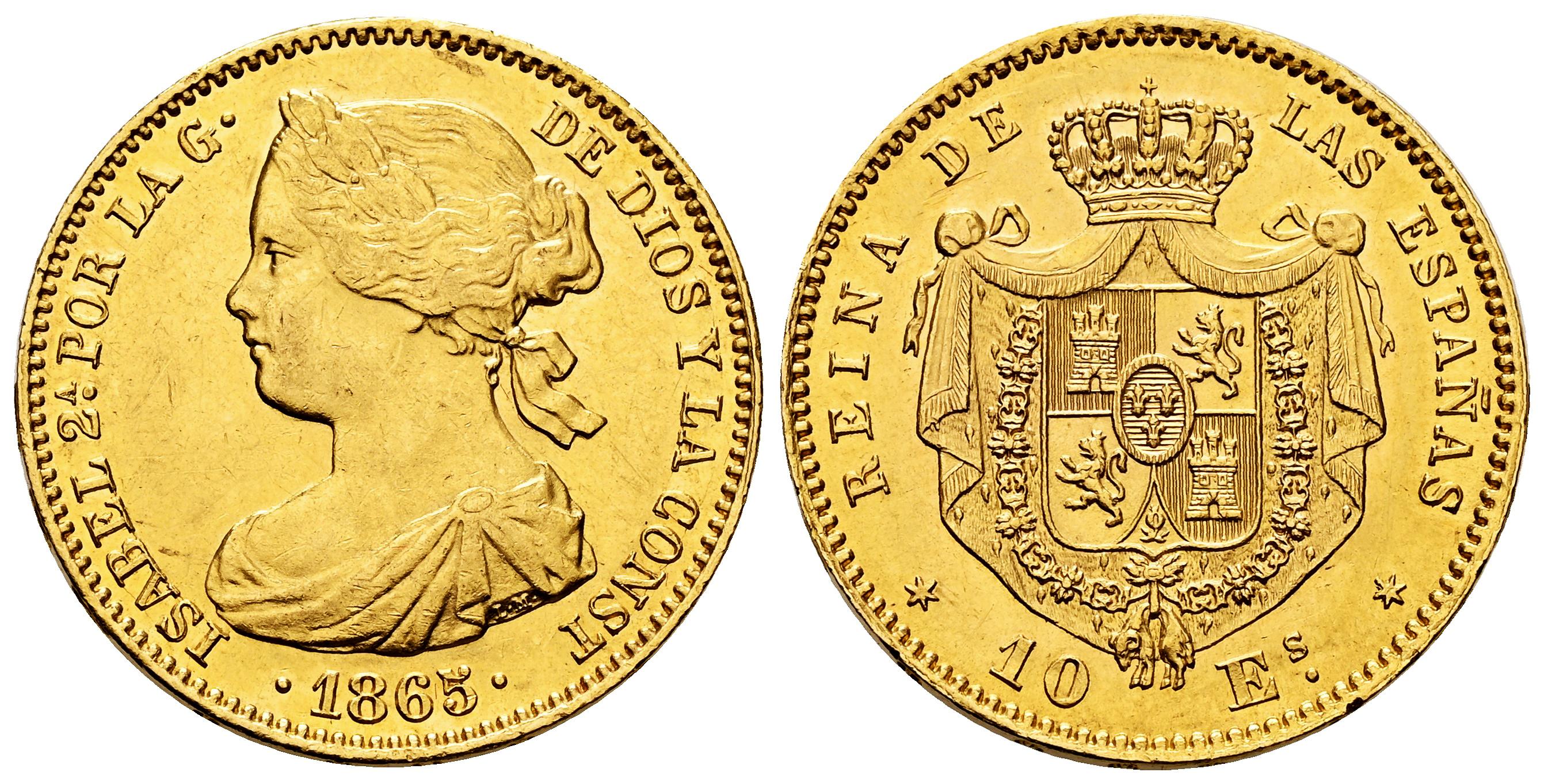 Elizabeth II (1833-1868). 10 escudos. 1865. Madrid. (Cal-810). Au. 8,33 g. Minor hairlines. Original luster. AU/Almost MS. Est...700,00.