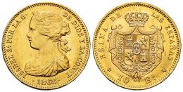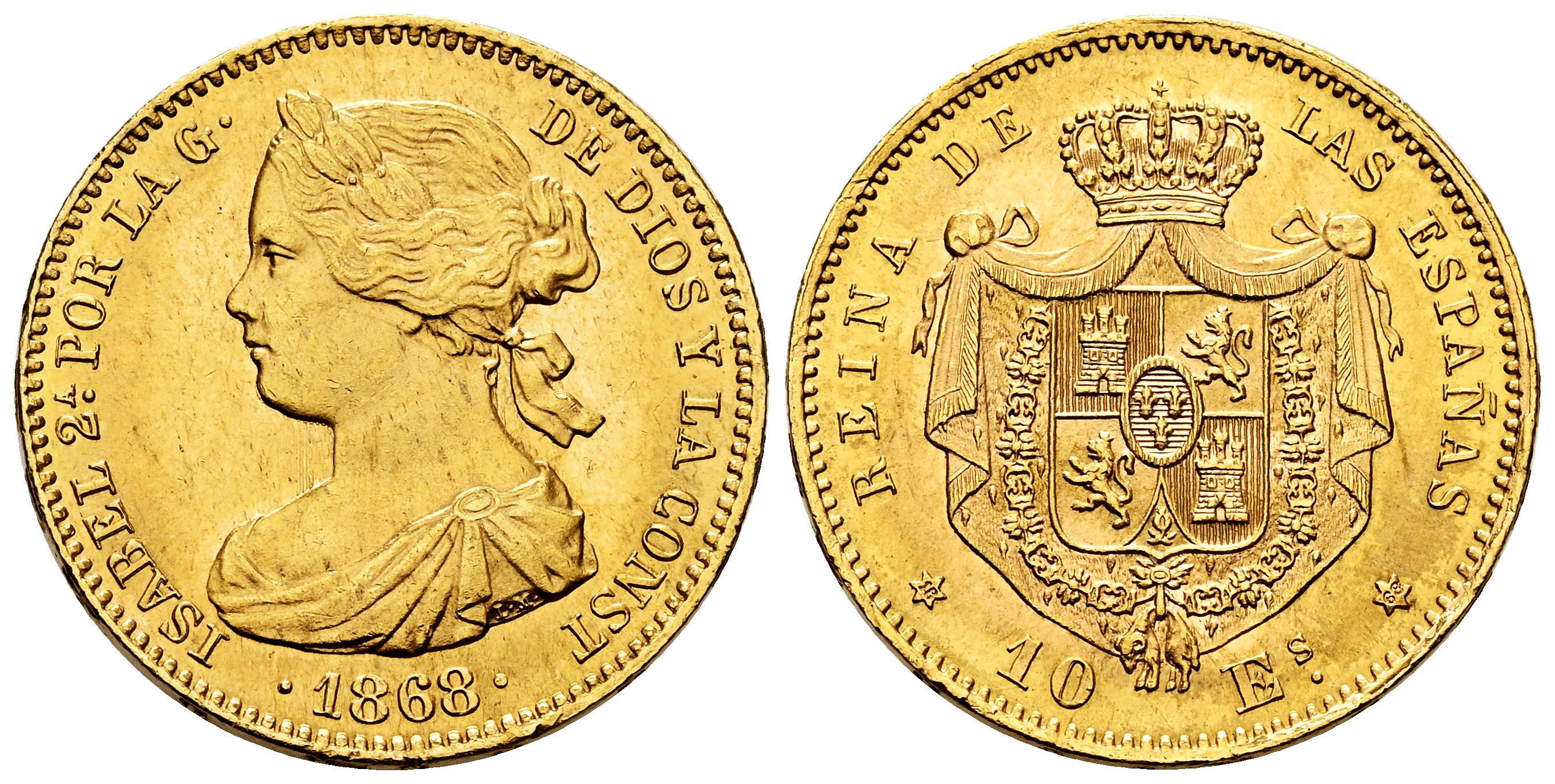 Elizabeth II (1833-1868). 10 escudos. 1868*18-68. Madrid. (Cal-815). Au. 8,48 g. Original luster. AU/Almost MS. Est...700,00.