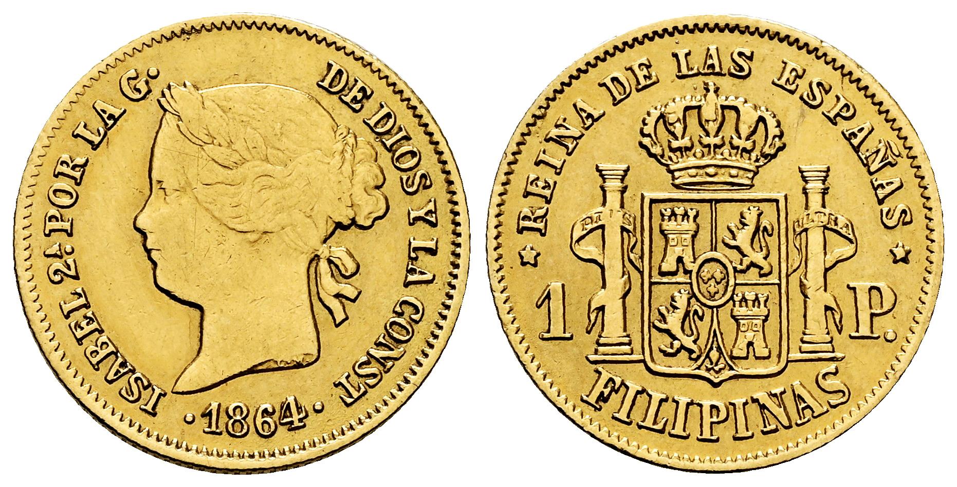 Elizabeth II (1833-1868). 1 peso. 1864/2. Manila. (Cal-824). Au. 1,67 g. Cleaned. Rare overdate. VF/Choice VF. Est...300,00.