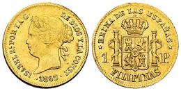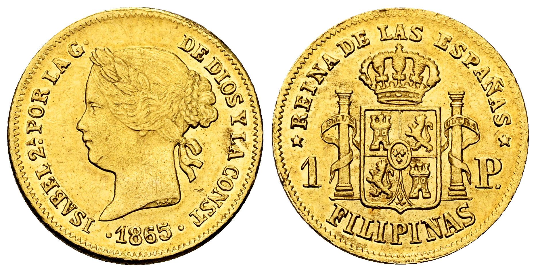Elizabeth II (1833-1868). 1 peso. 1865. Manila. (Cal-829). Au. 1,73 g. Traces of luster. Scarce in this grade. Almost XF. Est...500,00.