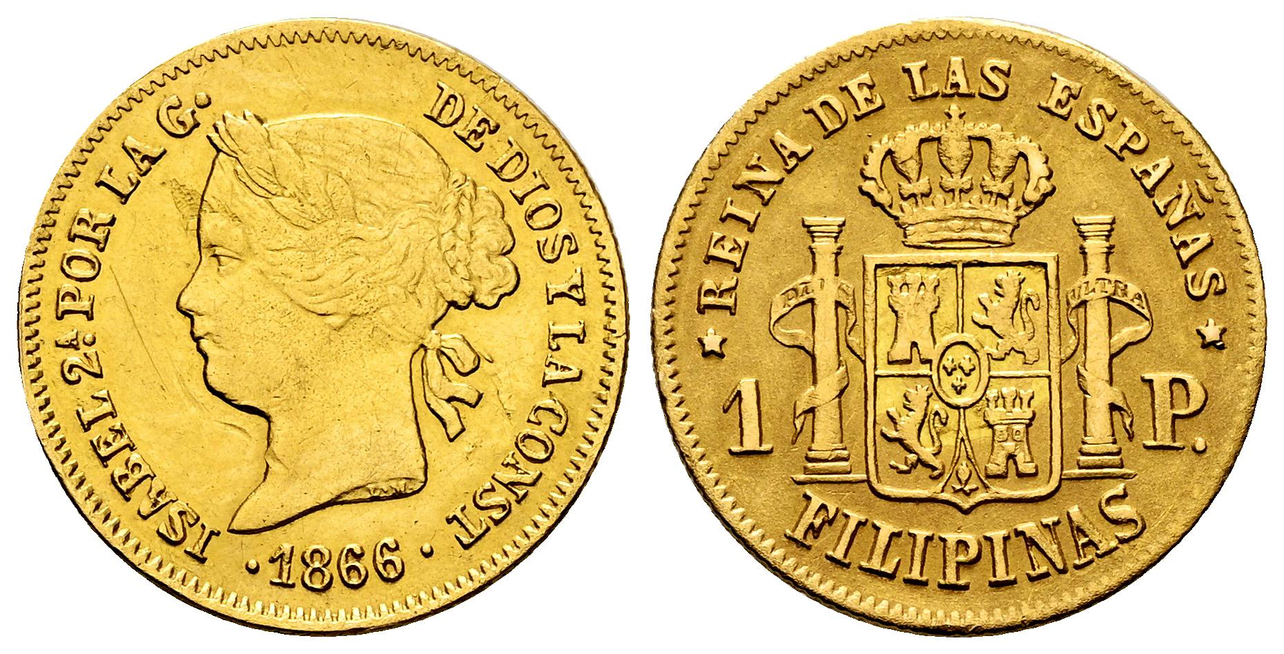 Elizabeth II (1833-1868). 1 peso. 1866. Manila. (Cal-830). Au. 1,68 g. Planchet flaw on obverse. Scratches. Scarce. Choice VF. Est...300,00.