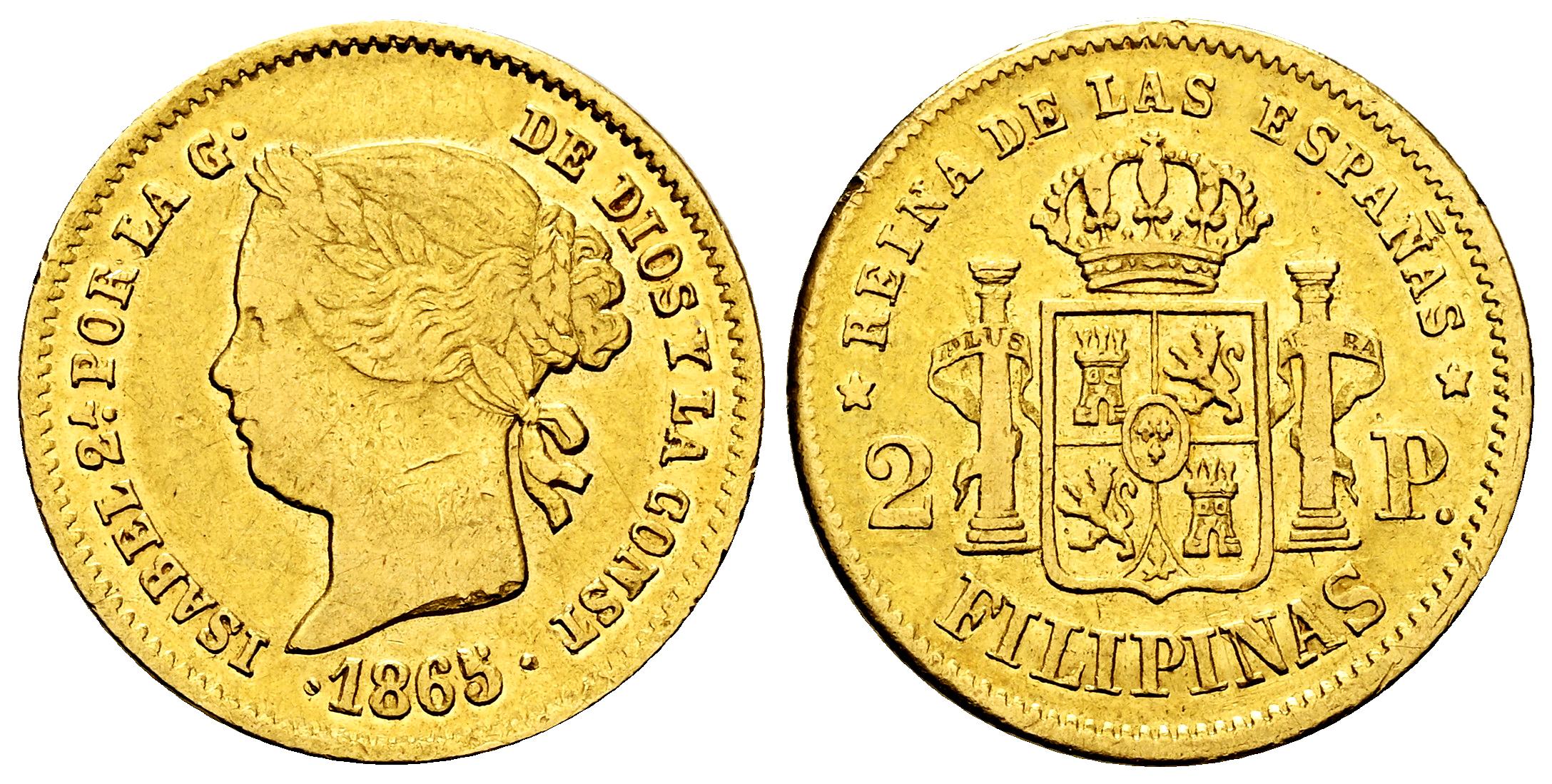 Elizabeth II (1833-1868). 2 pesos. 1865. Manila. (Cal-845). Au. 3,38 g. Hairline on obverse. Almost VF/VF. Est...350,00.