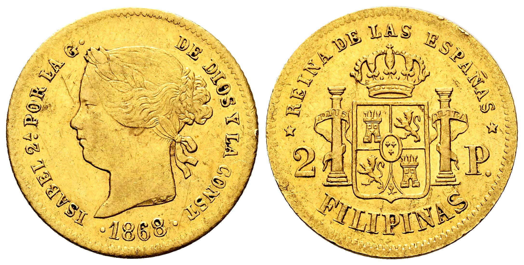 Elizabeth II (1833-1868). 2 pesos. 1868. Manila. (Cal-850). Au. 3,36 g. Traces of luster. Nice color. Scarce in this grade. Almost XF/XF. Est...600,00.