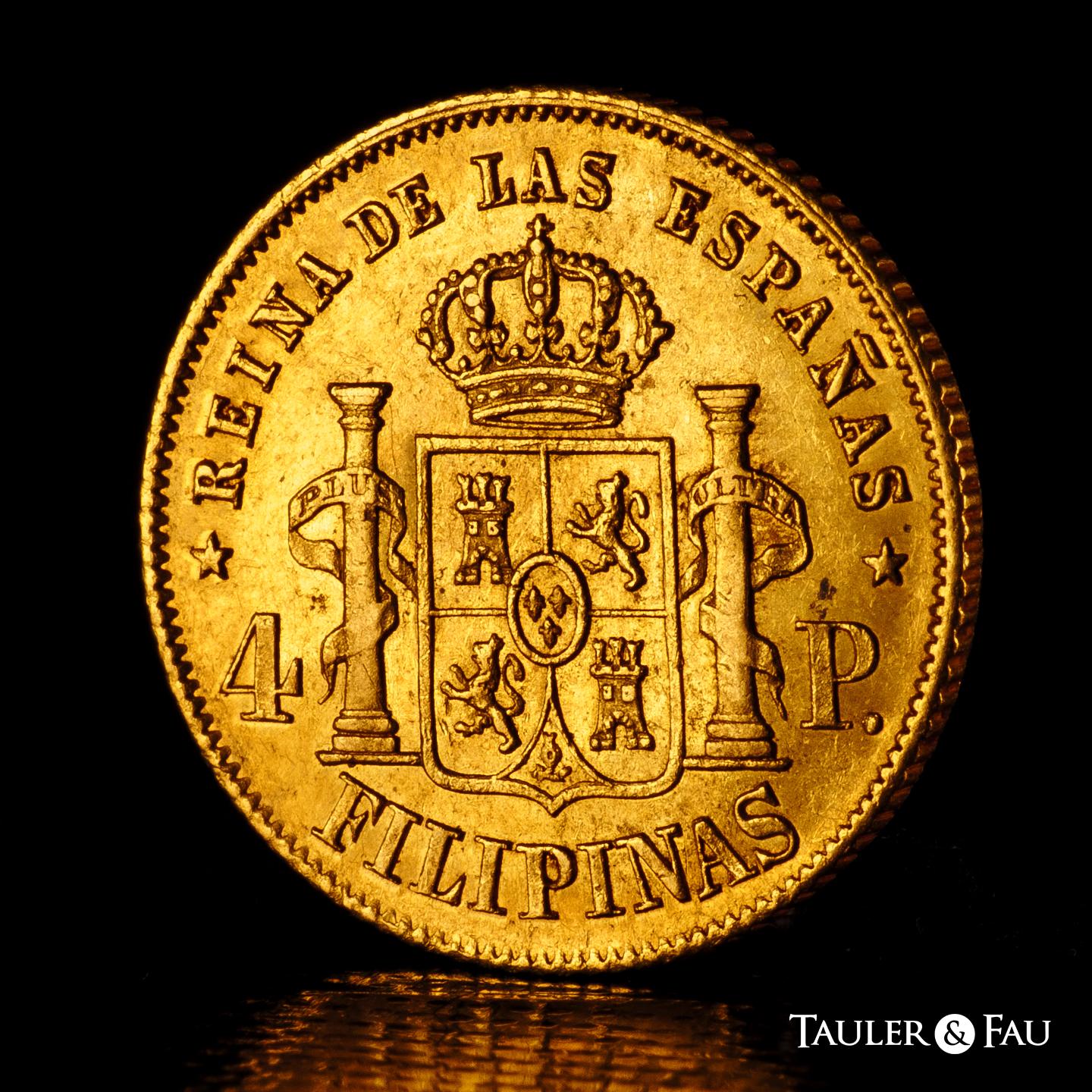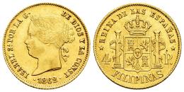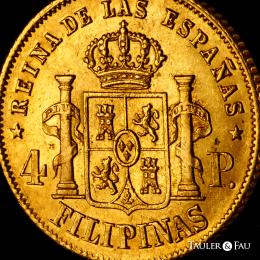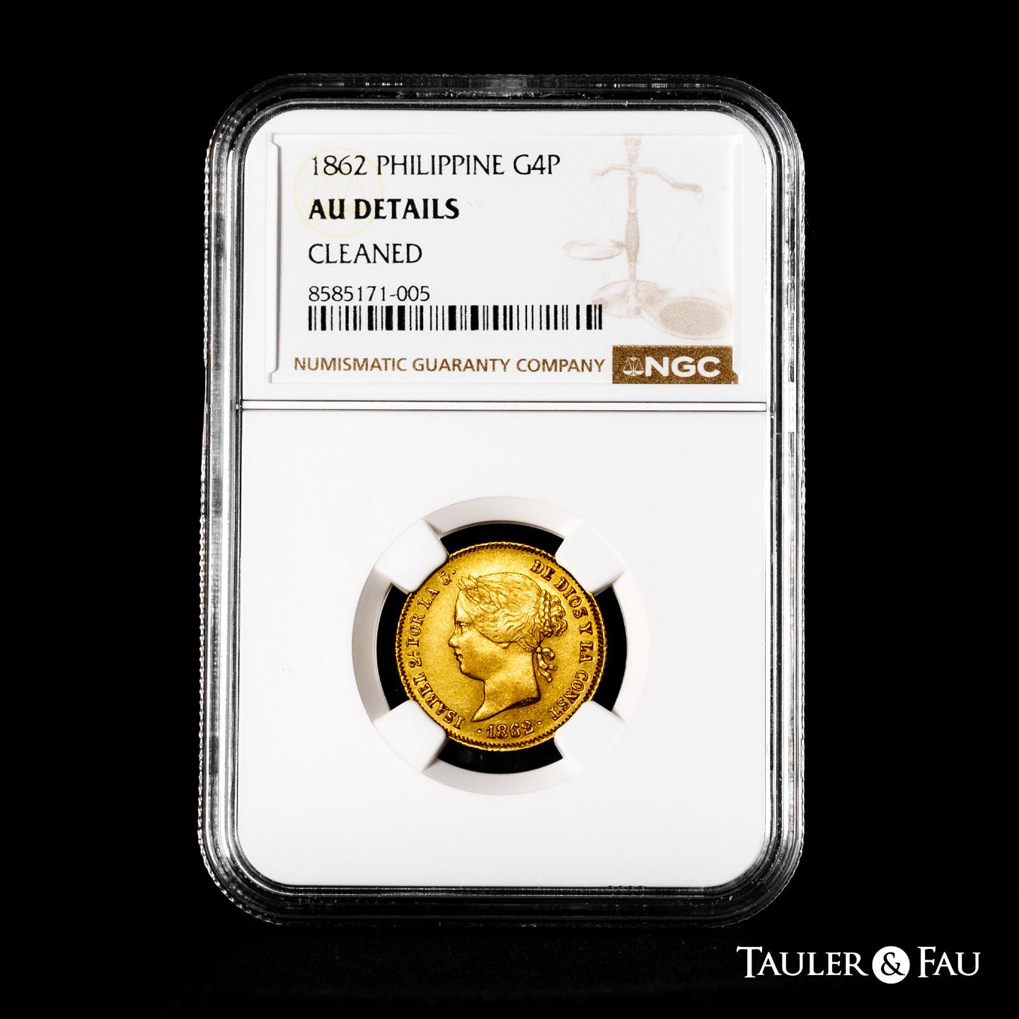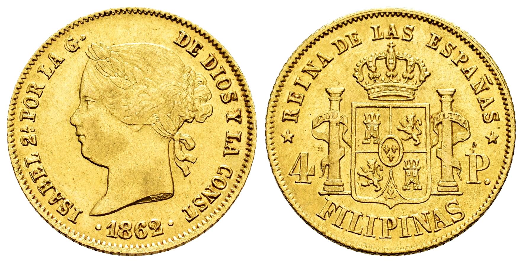 Elizabeth II (1833-1868). 4 pesos. 1862/1. Manila. (Cal-853). Au. 6,76 g. Overdate. Traces of luster. Scarce. Slabbed by NGC as AU Details. Cleaned. Est...800,00.
