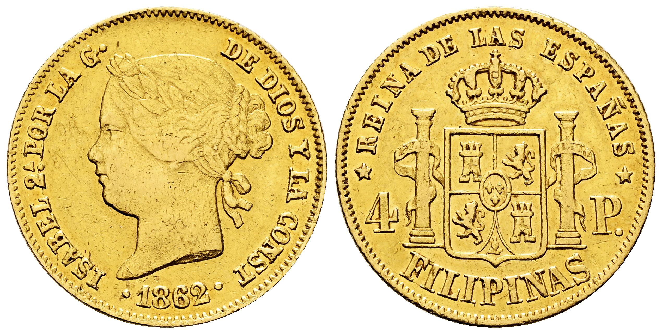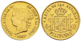 Elizabeth II (1833-1868). 4 pesos. 1862. Manila. (Cal-854). Au. 6,72 g. Traces of luster. Scarce in this grade. Choice VF/Almost XF. Est...700,00.