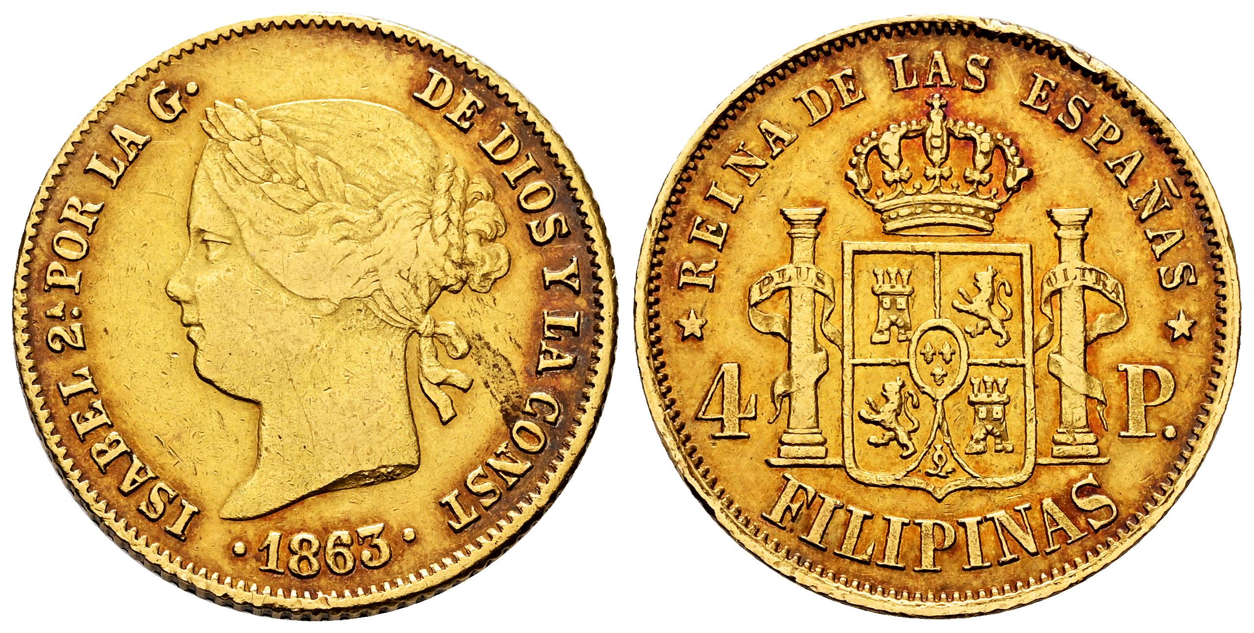 Elizabeth II (1833-1868). 4 pesos. 1863. Manila. (Cal-856). Au. 6,74 g. Minor nicks on edge. Traces of luster. Lightly toned. Choice VF. Est...600,00.