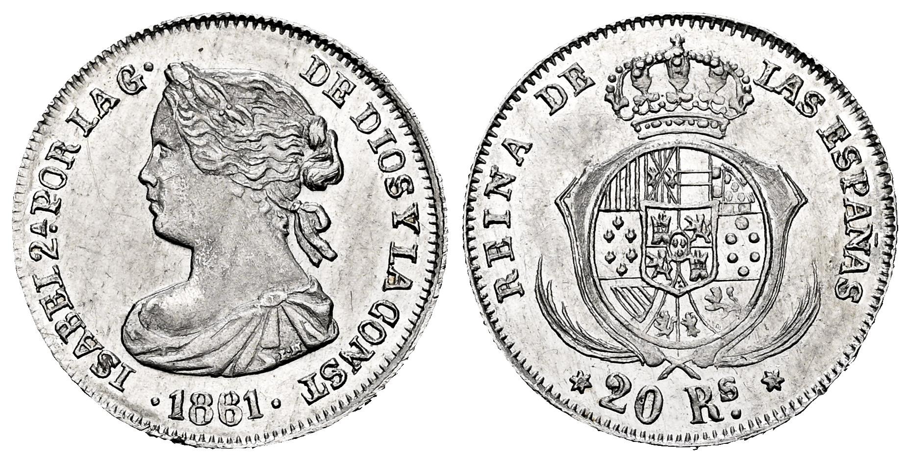 Elizabeth II (1833-1868). 20 reales. 1861. Madrid. (Cal-672 var.). Platinum. 1,81 g. Contemporary counterfeit in platinum. Original luster. Rare. Mint state. Est...200,00.