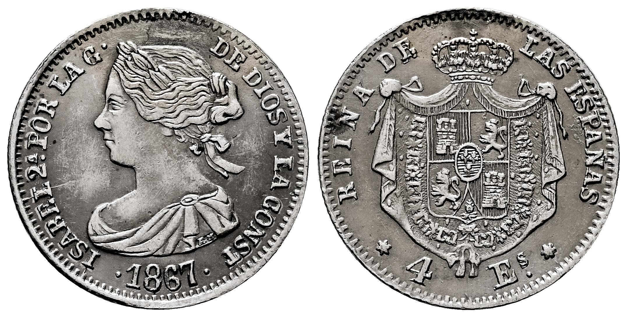 Elizabeth II (1833-1868). 4 escudos. 1867. Madrid. (Barrera-853). Platinum. 3,30 g. Contemporary counterfeit in platinum. Choice VF. Est...300,00.