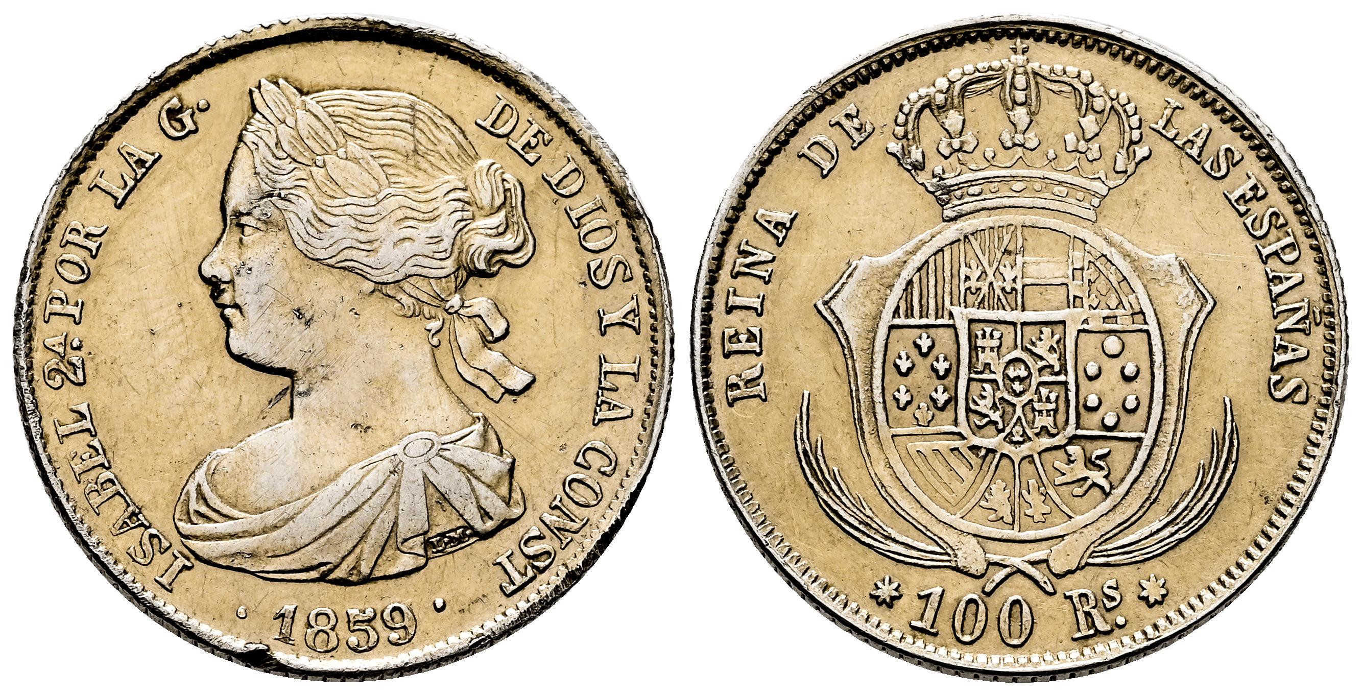 Elizabeth II (1833-1868). 100 reales. 1859. Sevilla. Platinum. 8,44 g. Contemporary counterfeit. Choice VF. Est...250,00.