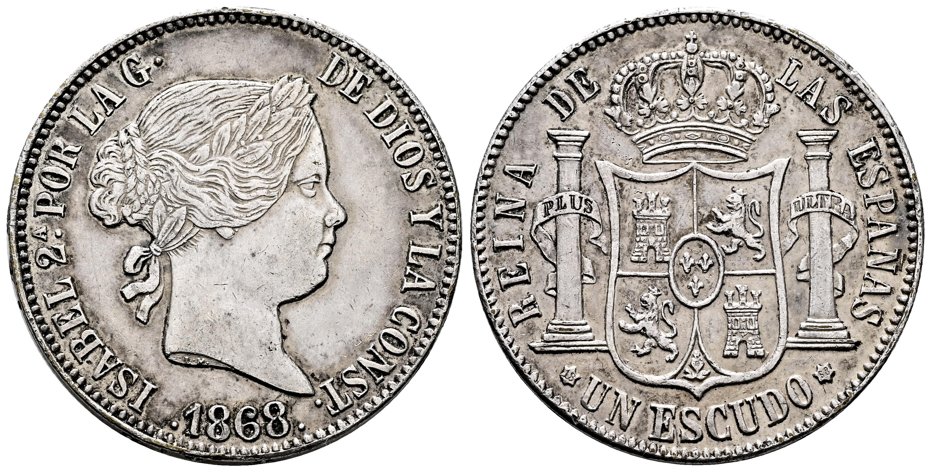 Elizabeth II (1833-1868). 1 escudo. 1868*18-68. Madrid. (Cal-567). Ag. 12,15 g. Contemporary counterfeit. Almost XF. Est...50,00.
