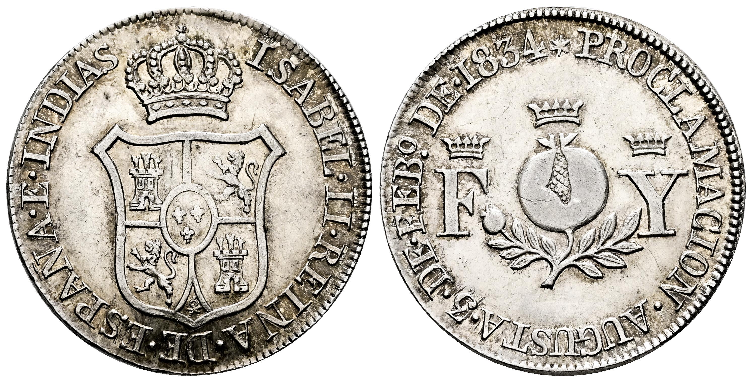 Elizabeth II (1833-1868). "Proclamation" medal. 1834. Granada. (Herrera-14). (Vq-607). Anv.: ISABEL · II · REINA · DE · ESPANA · E · IND · . Rev.: ✶ PROCLAMACION · AUG · 3 · DE · FEBR · DE · 1834. In the center F / Pomegranate / Y crowned. Ag. 2,84 g. 25 mm. Light bend. Nice tone and traces of luster. Rare. Almost XF/XF. Est...150,00.