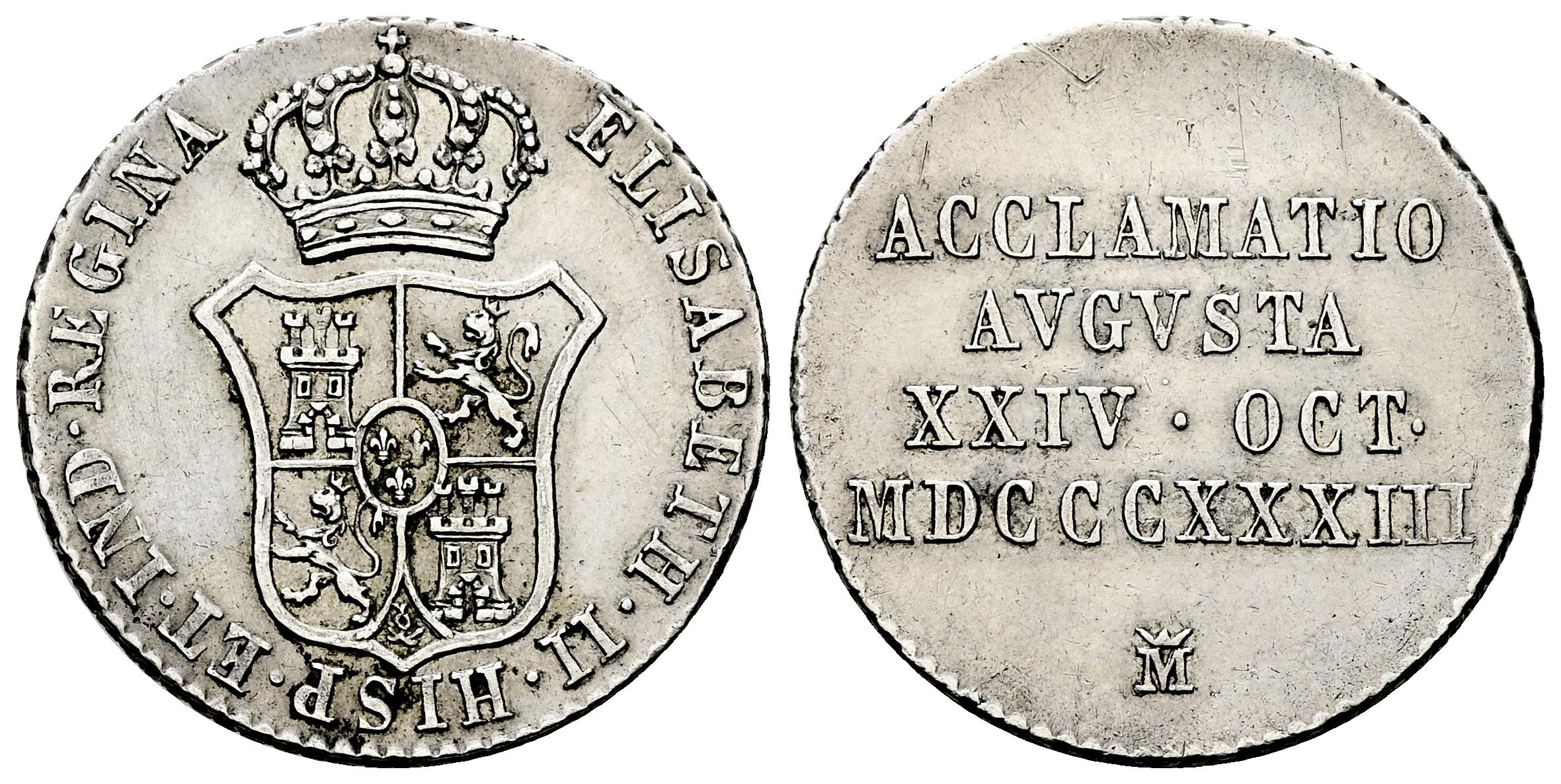 Elizabeth II (1833-1868). "Proclamation" medal. 1833. Madrid. (Herrera-24). Rev.: ACCLAMATIO AVGVSTA XXIV · OCT· MDCCCXXXIII. Ag. 3,02 g. 1 real module. Choice VF. Est...30,00.