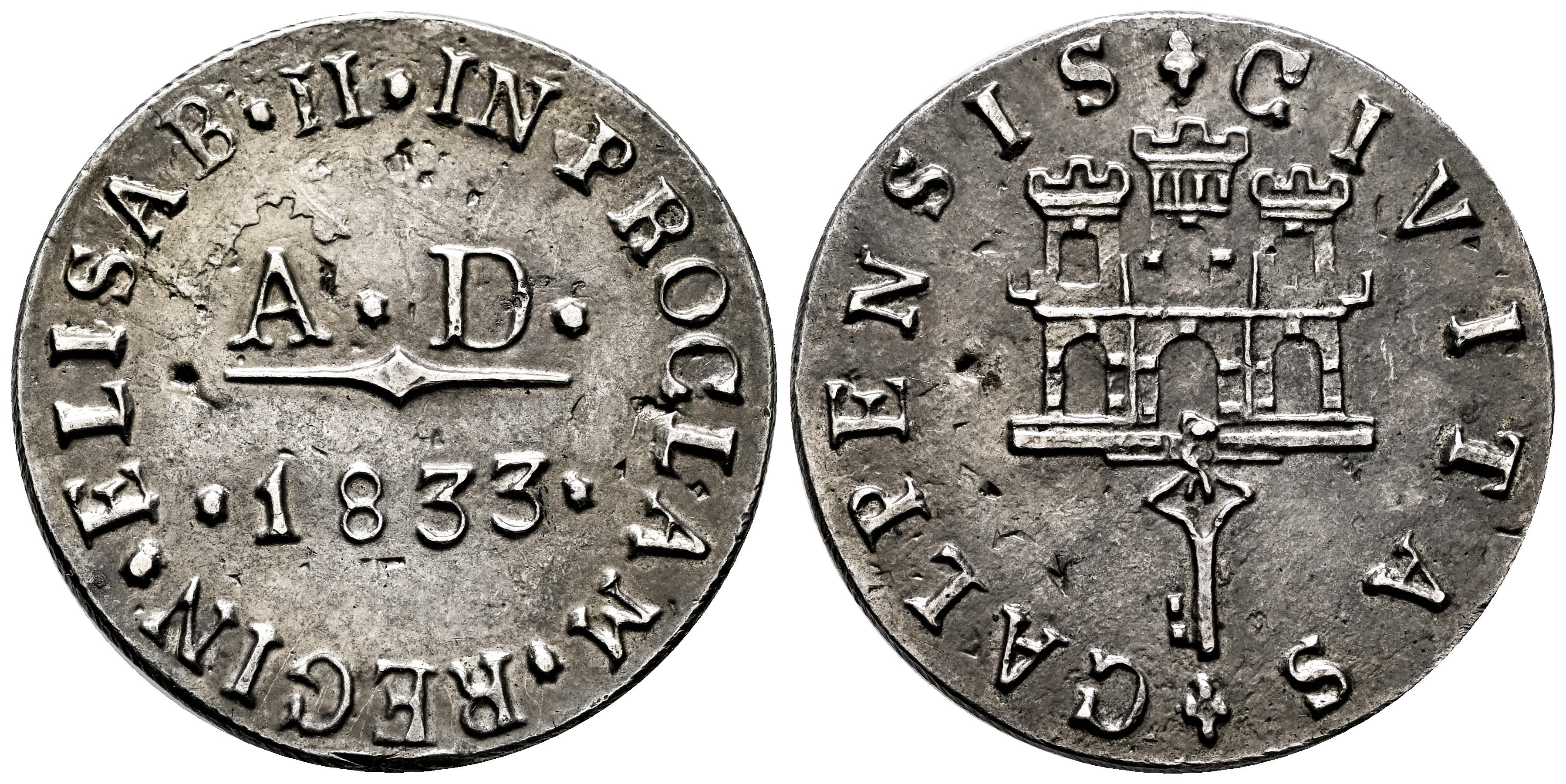 Elizabeth II (1833-1868). "Proclamation" medal. 1833. San Roque (Cadiz). (Herrera-26). (Vives-756). (Vq-13379). Ag. 9,27 g. 30 mm. Cast silver. Rare. Almost XF. Est...300,00.