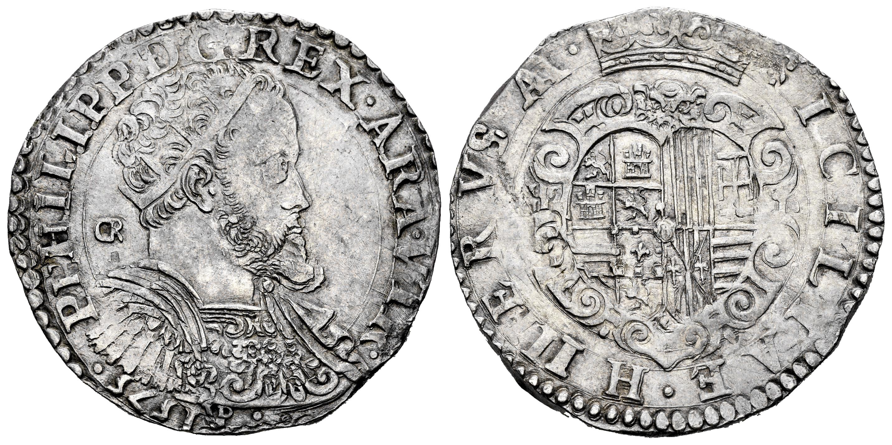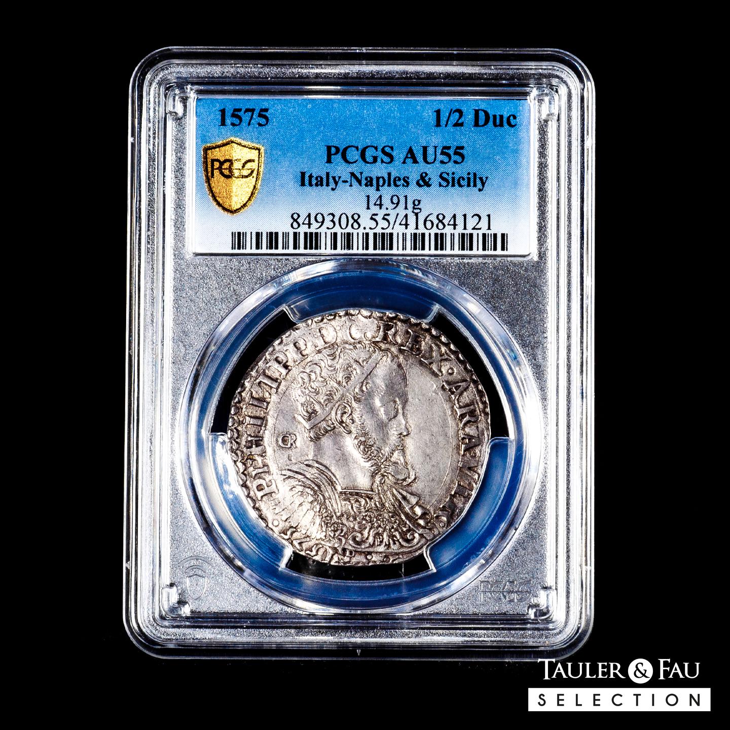 Philip II (1556-1598). 1/2 ducado. 1575. Naples. GR/VP. (Tauler-684). (Vti-360). (Mir-174/7). Ag. 14,91 g. GR behind and VP below the bust. Soft tone on obverse. Nice strike, good specimen for this type. Rare in this condition. Slabbed by PCGS as AU 55 (Top Pop), the finest known in the PCGS census. Est...600,00.