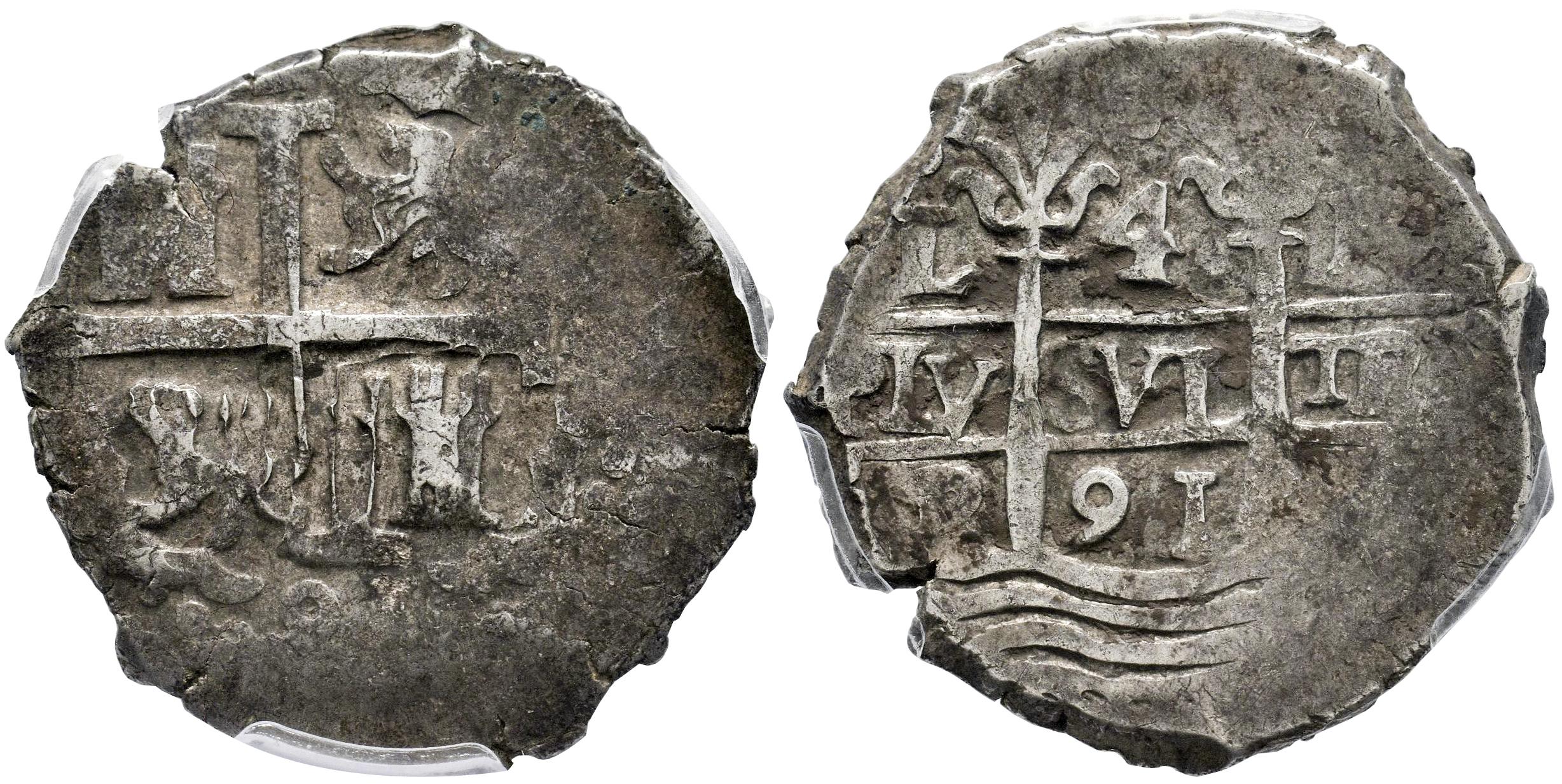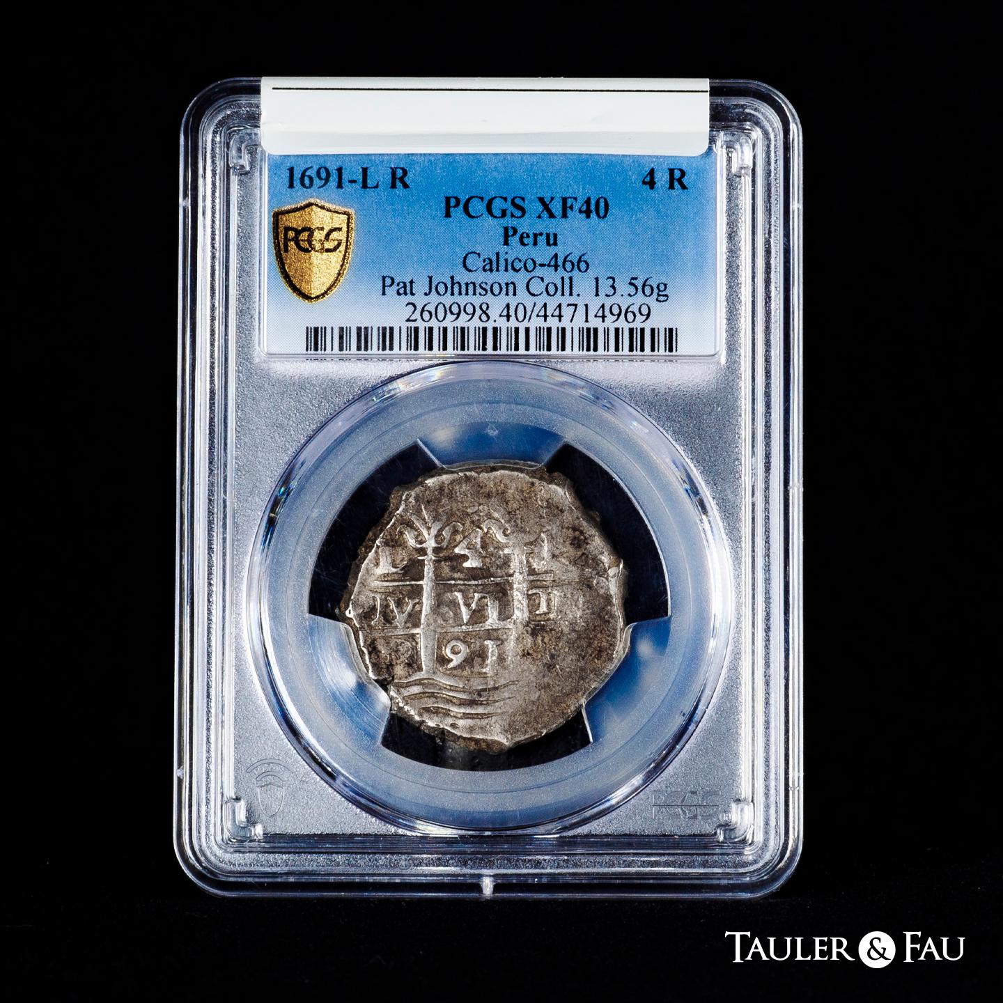Charles II (1665-1700). 4 reales. 1691. Lima. R. (Cal-466). Ag. 13,56 g. Double date, one of them partially visible. Lightly toned. Very rare. Slabbed by PCGS as XF 40. Ex Pat Johnson Collection. Est...1500,00.