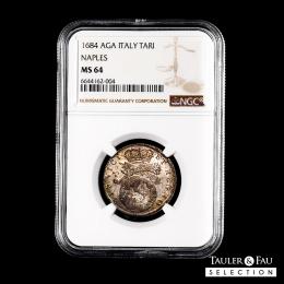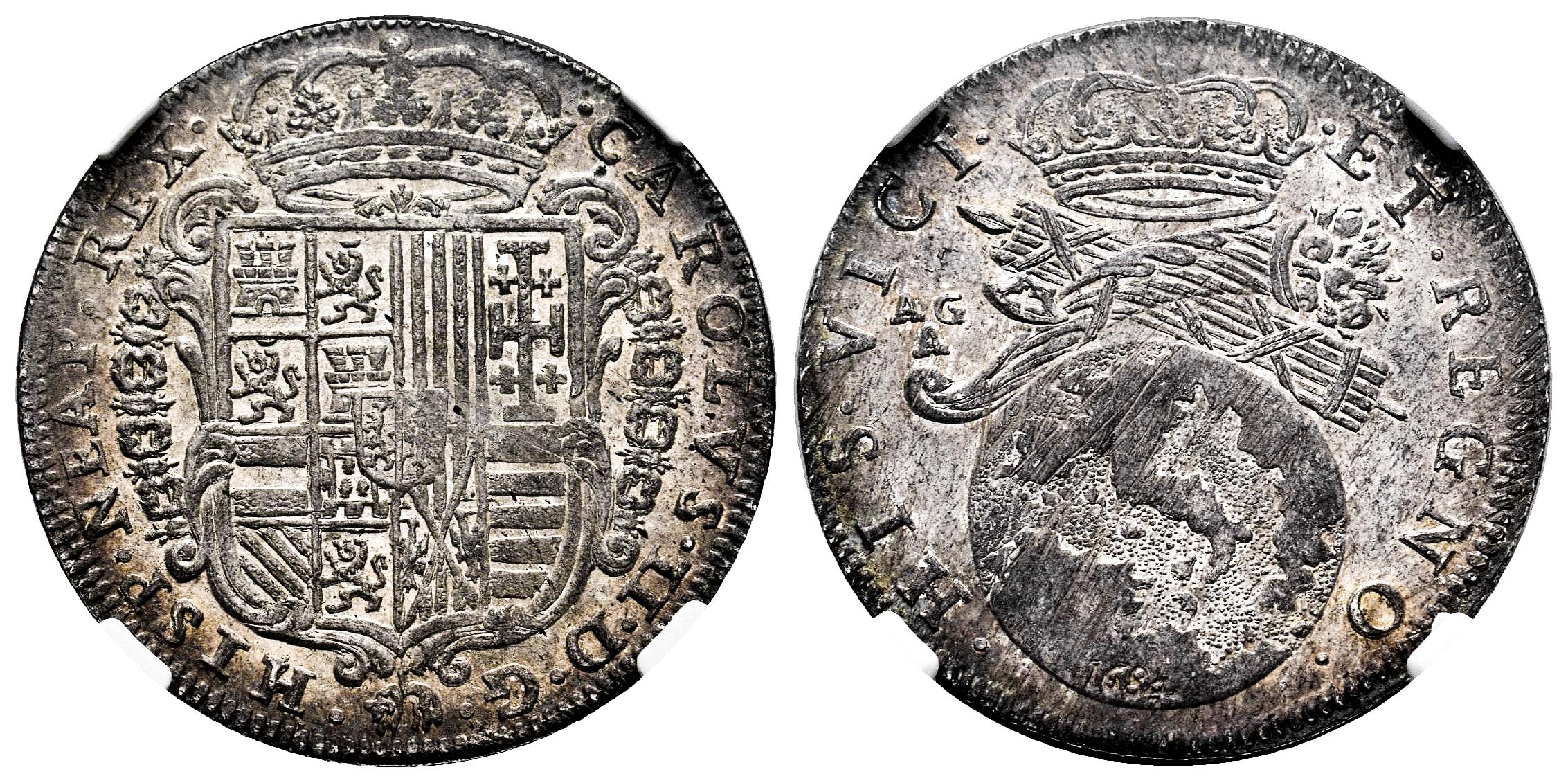 Charles II (1665-1700). 1 tari. 1684. Naples. AG/A. (Tauler-3174). (Vti-168). Ag. Lovely old cabinet tone with luster. Minor striking lines. Magnificent specimen. Slabbed by NGC as MS 64. Est...600,00.