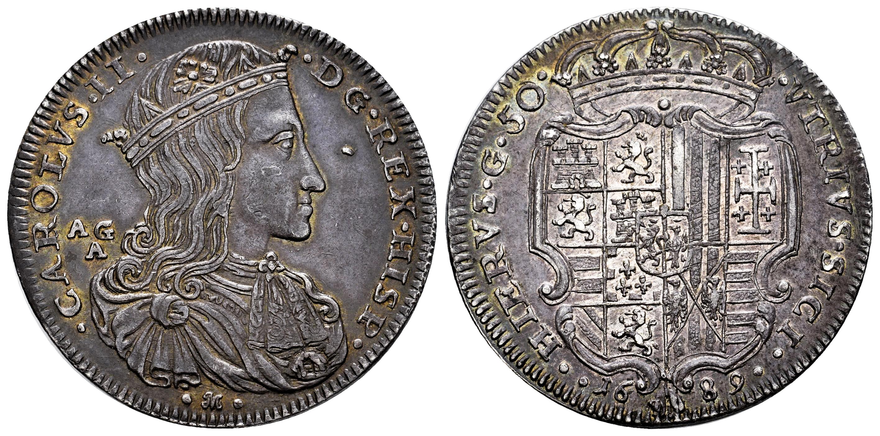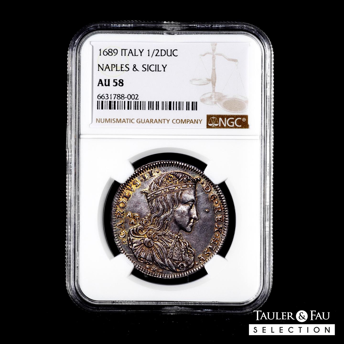 Charles II (1665-1700). 1/2 ducado. 1689. Naples. AG/A. (Tauler-3194). (Vti-187). (Mir-296). Ag. Lovely old cabinet tone. Traces of luster. Rare in this condition. Slabbed by NGC as AU 58 (Top Pop), the finest known in the NGC census. Est...600,00.