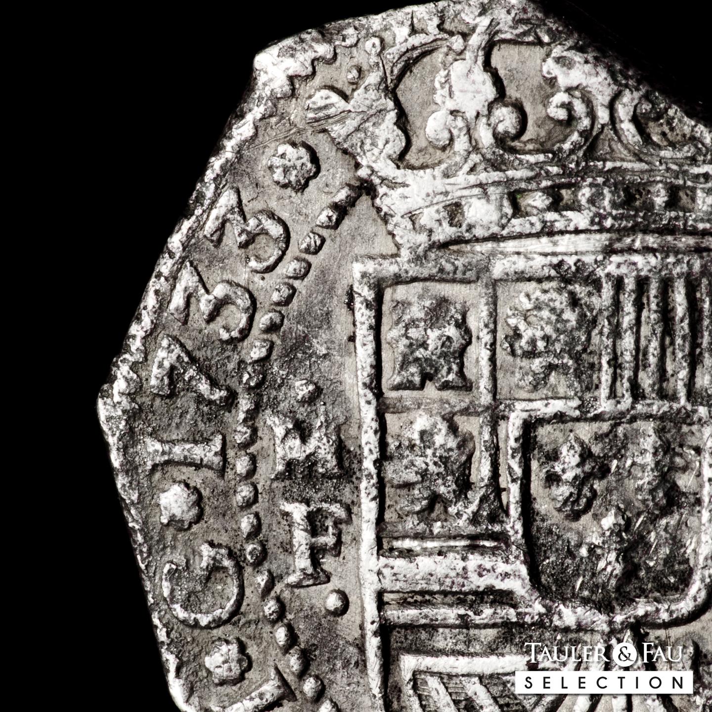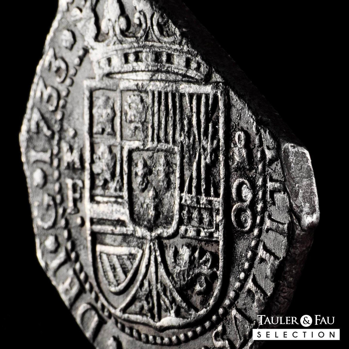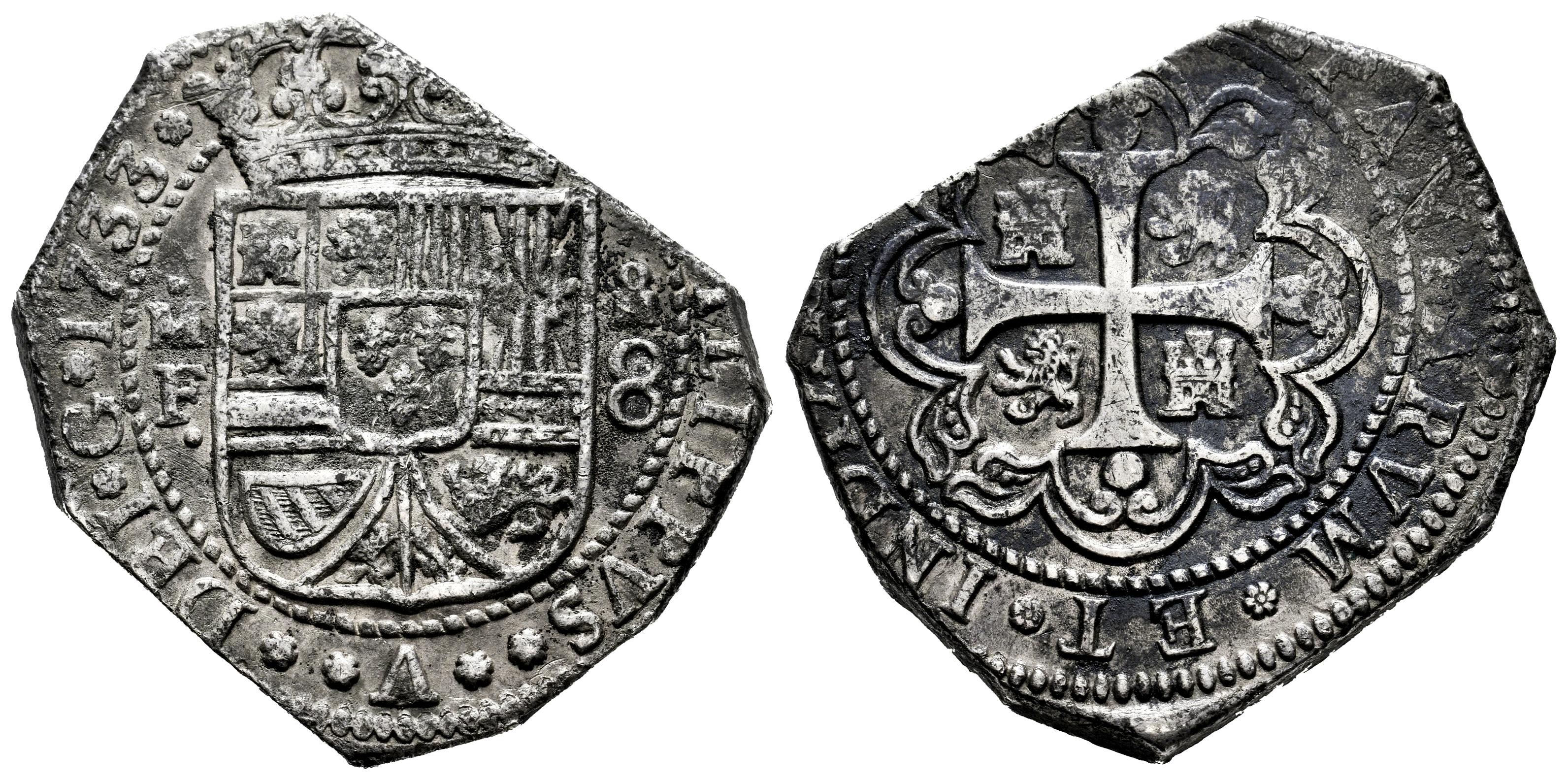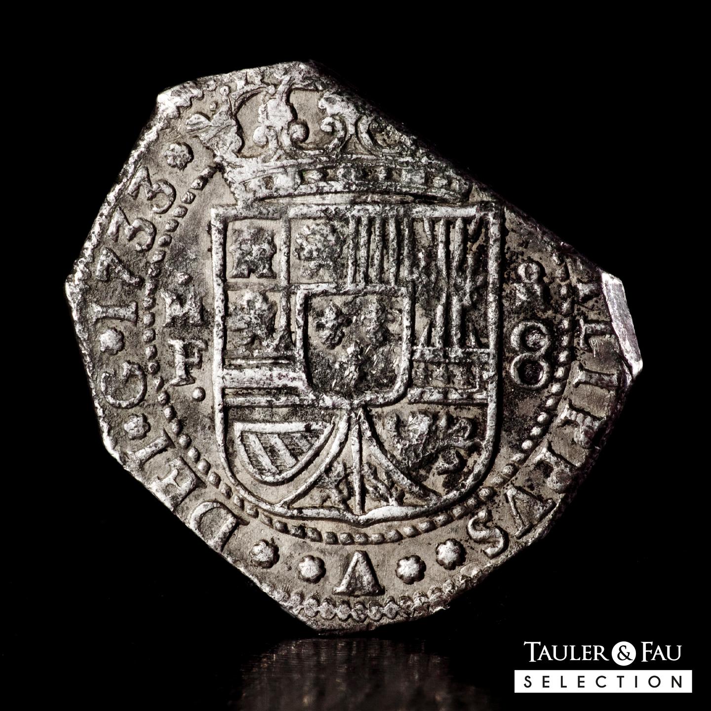 Shipwreck coins. Philip V (1700-1746). 8 reales. 1733. Mexico. MF. (Cal-1431). . 26,57 g. “Klippe” type. Very complete, with full 4-digit date and all details clearly visible, included the name of the king. Some light surface marine corrosion. Light tone. Rare.