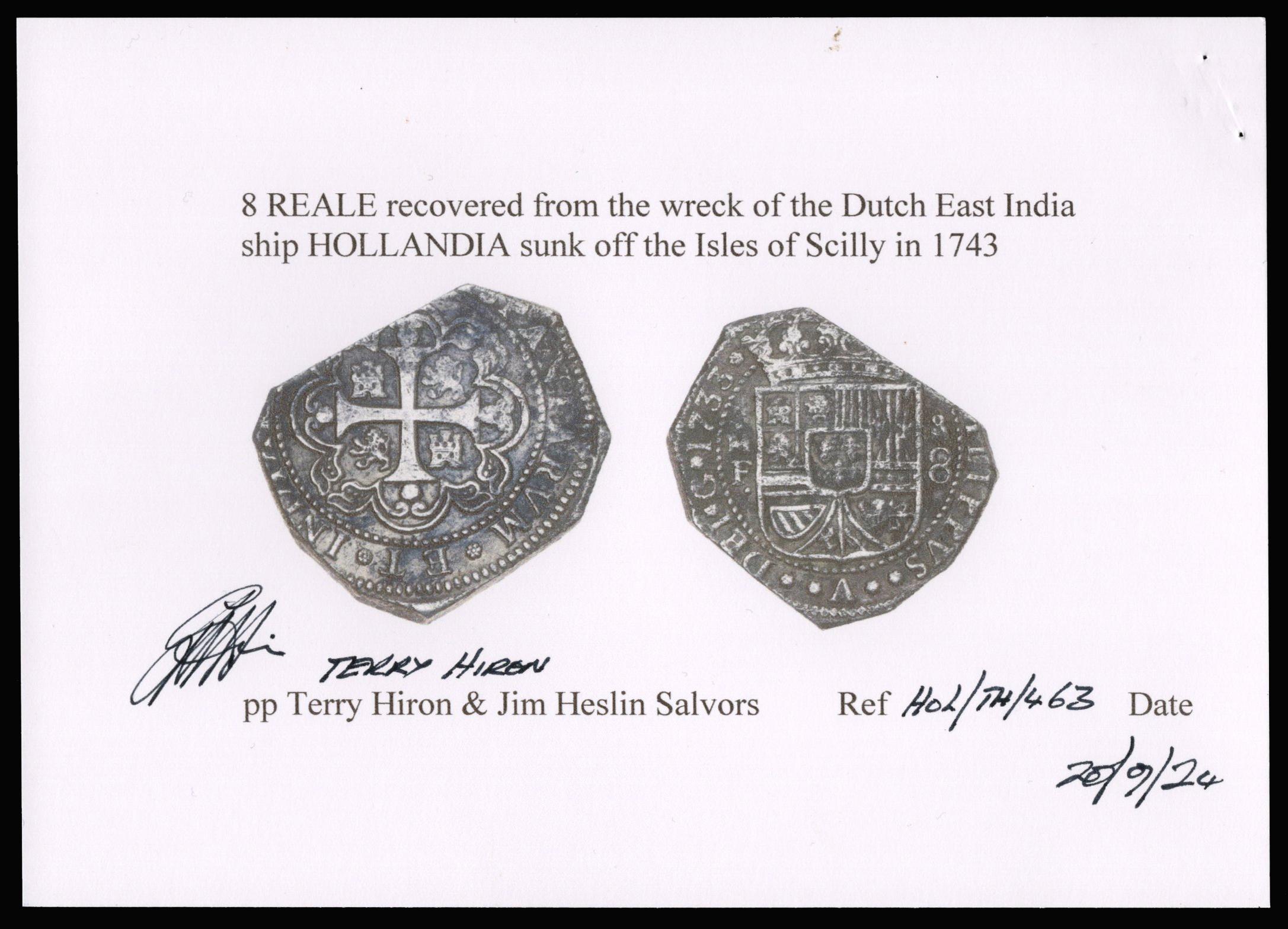 The Hollandia, a Dutch East Indiaman, sank on July 13, 1743 after being blown off course and striking Gunner Rock, descending to about 110 feet of depth near the Scilly Isles with no survivors. The wreck was located in 1971 by a team led by Rex Cowan, who in the following years recovered more than 35,000 silver coins, part of the roughly 130,000 guilders recorded as its monetary cargo.