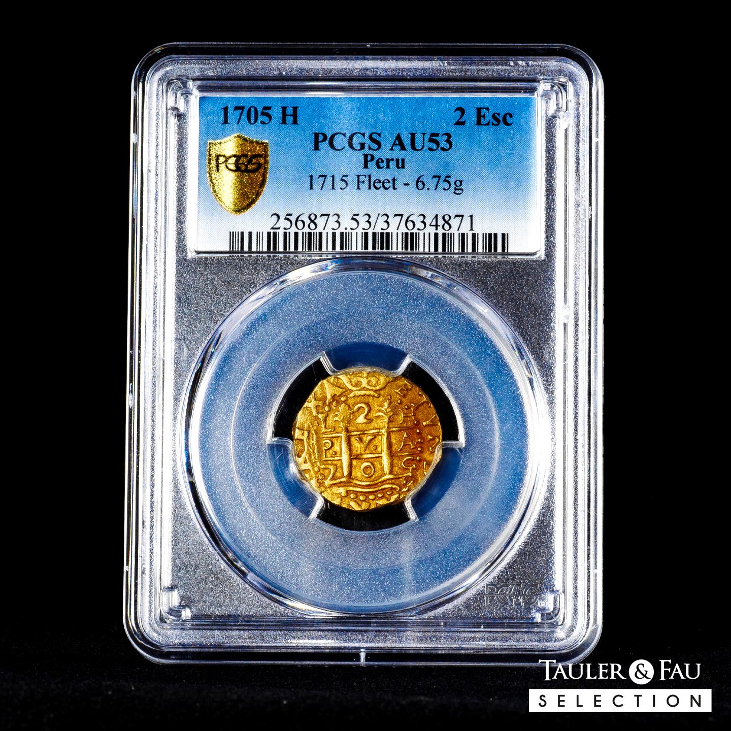 Shipwreck coins. Philip V (1700-1746). 2 escudos. 1705. Lima. H. (Cal-1822). (Tauler-244). . 6,75 g. Uniformly struck, with all key elements clearly visible and full legends throughout. Attractive orange toning enhances its visual eye appeal. Very rare, especially in this level of preservation.