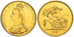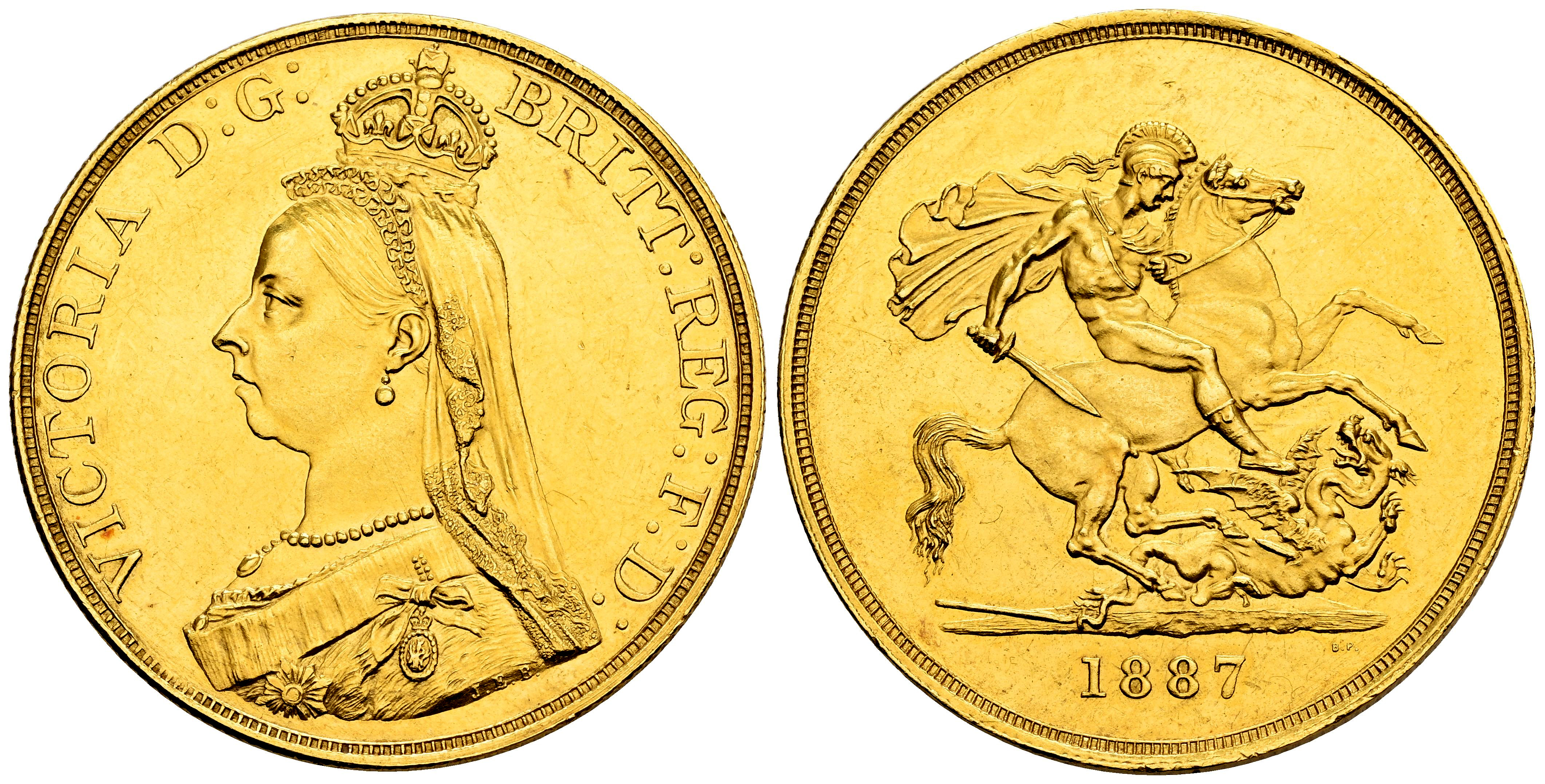 Great Britain. Victoria. 5 pounds. 1887. (S-3864). (Fried-390). Au. 39,99 g. Full luster. Surface hairlines and nicks on the edge. Almost MS. Est...7000,00.
