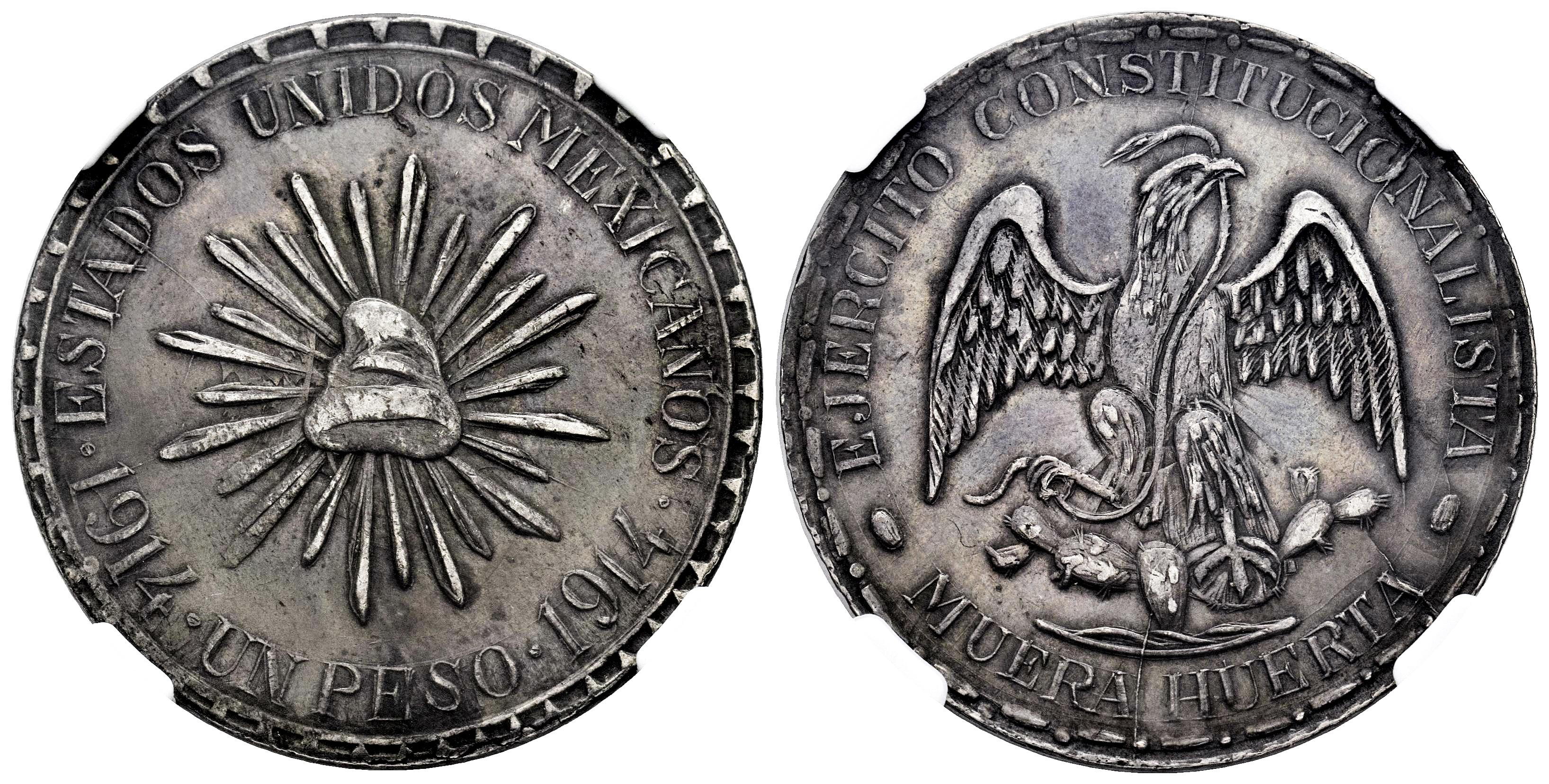 Mexico. 1 peso. 1914. Durango. Cuéncame. "Muera Huerta". (Km-622). Ag. One of the most popular issues of the Mexican Revolutionary period. Variety with dotted-and-dashed border on obverse and beaded edge on reverse. Soft luster throughout, with dark patina and light signs of circulation. A perfect specimen for the collector seeking a representative example of this highly sought-after type. Slabbed by NGC as XF 45. Est...3000,00.