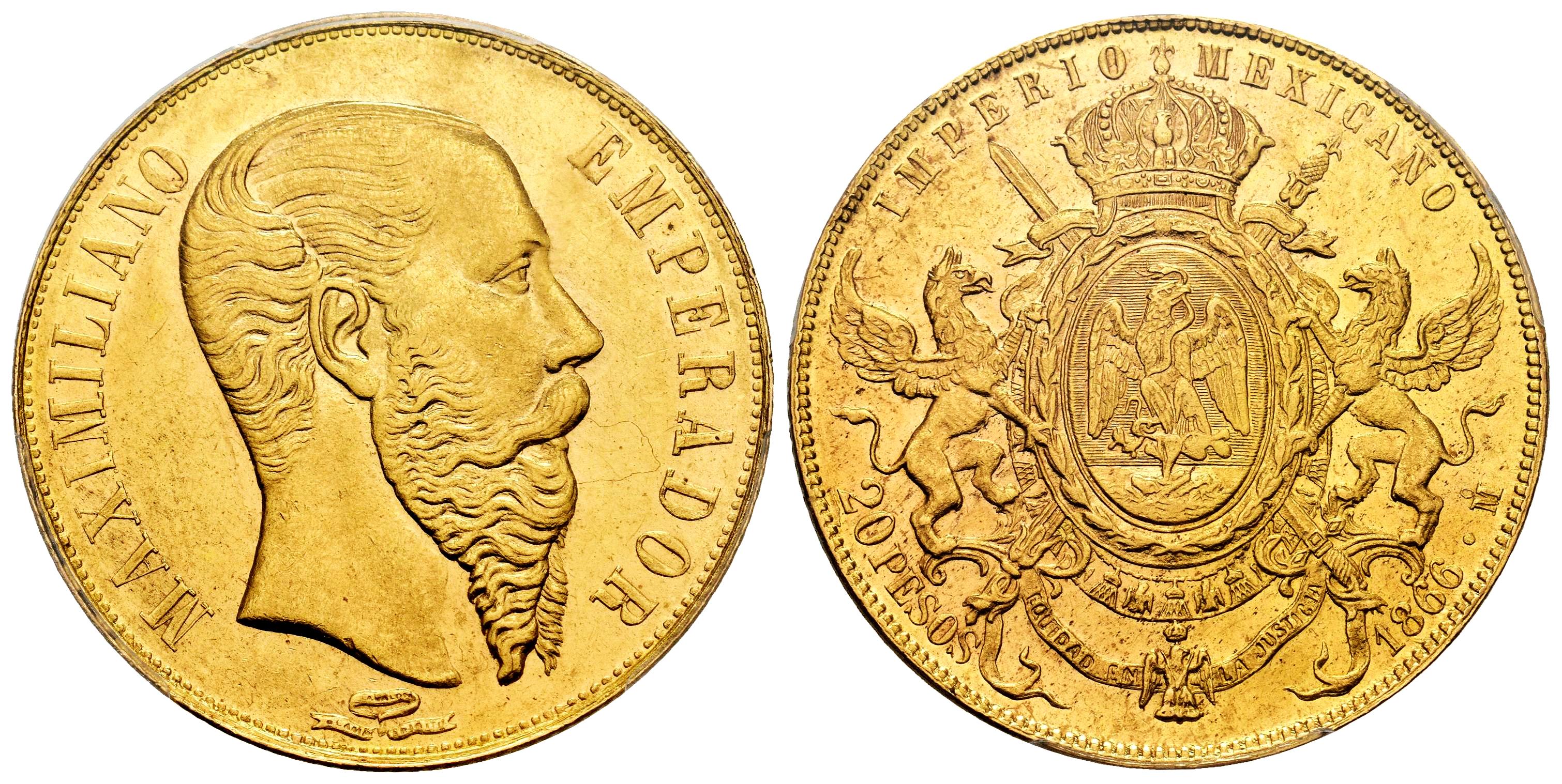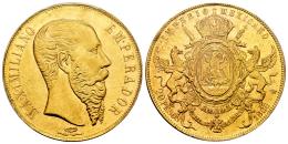Mexico. Maximiliano. 20 pesos. 1866. Mexico. (Km-389). (Fried-62). Au. The highest denomination and the only gold issue struck during the Second Empire.