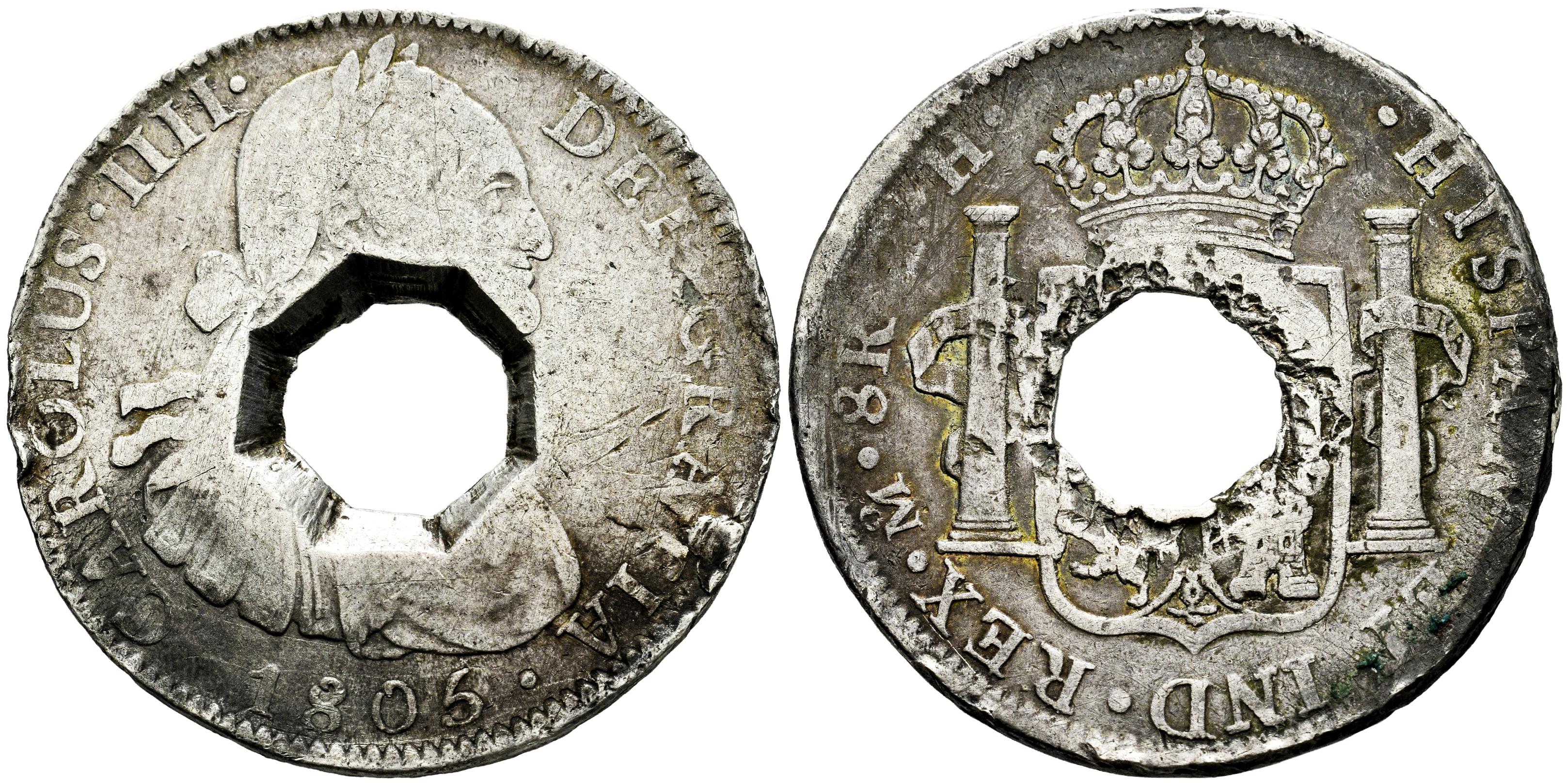 Trinidad. 9 Bitts (9 Shillings) Countermark, ND (1811). Authorized on June 11 of that year, consisting of a central octagonal cutout with plain edges pierced from the obverse of an 1805-TH Mexico 8 Reales. (Km-A14.1); (Pridmore-3). The quantity of dollars to be cut was limited to no more than 25,000 pieces. The extracted central plugs were assigned a value of 1 Bitt (1 Shilling) and stamped with the letter “T”, identifying the colony. These central plugs were officially ordered withdrawn from circulation on December 1, 1823.