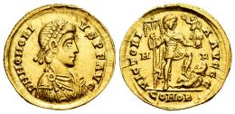 Honorius. Solidus. 394-395 AD. Mediolanum. (Ric-X 1206). (Depeyrot-16/2). (Toffanin-486/2). Anv.: D N HONORIVS P F AVG, pearl-diademed, draped and cuirassed bust to right. Rev.: VICTORIA AVGGG, emperor standing to right, holding labarum and Victory on globe, treading on captive to right; M-D across fields, COMOB in exergue. Au. 4,35 g. The letter D on the reverse is rectified on an R. Very rare. Almost XF. Est...1200,00.