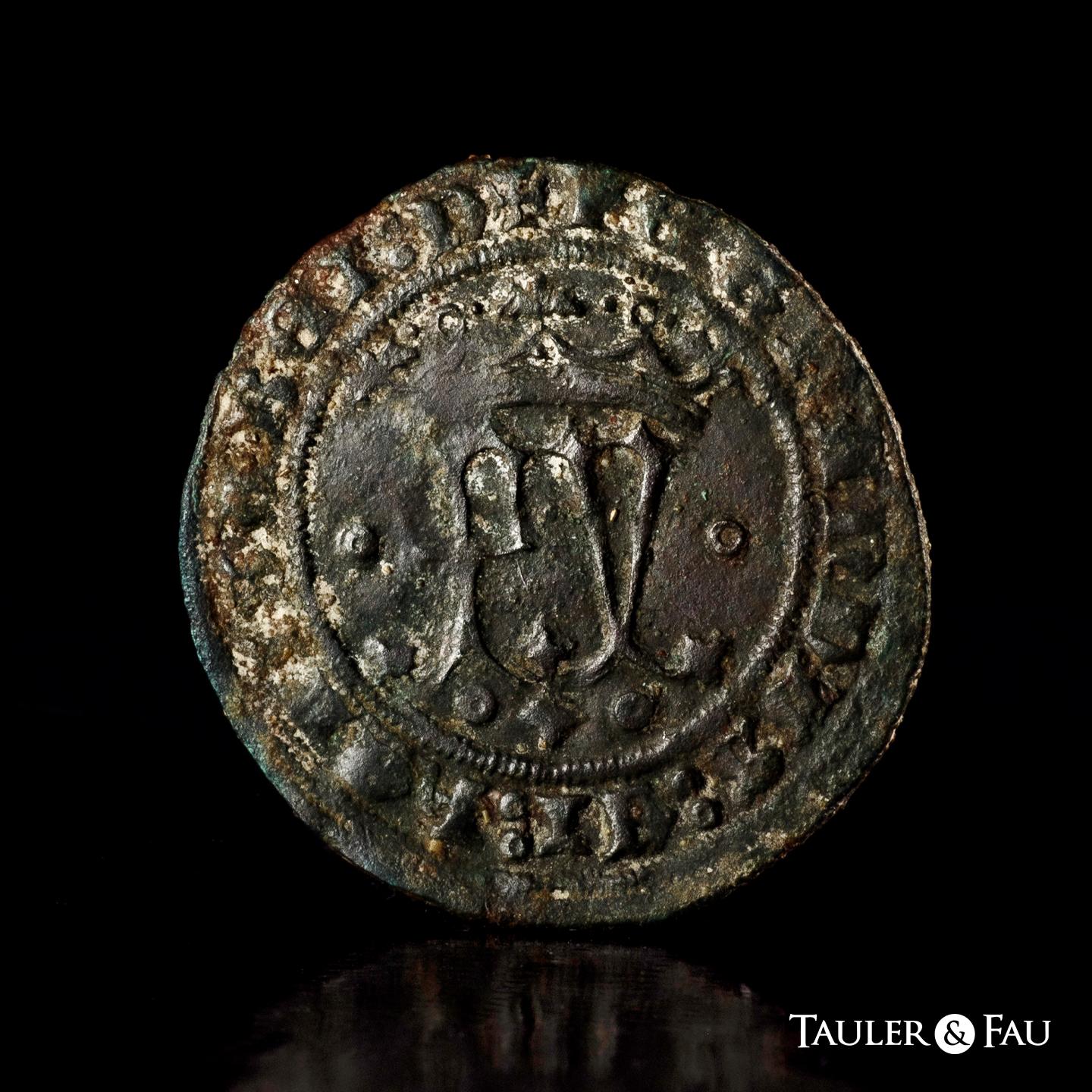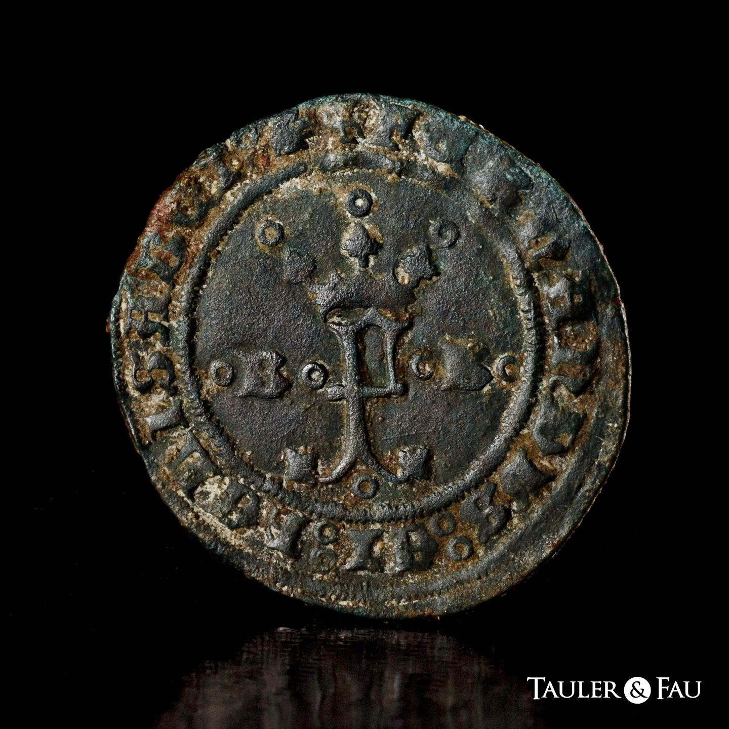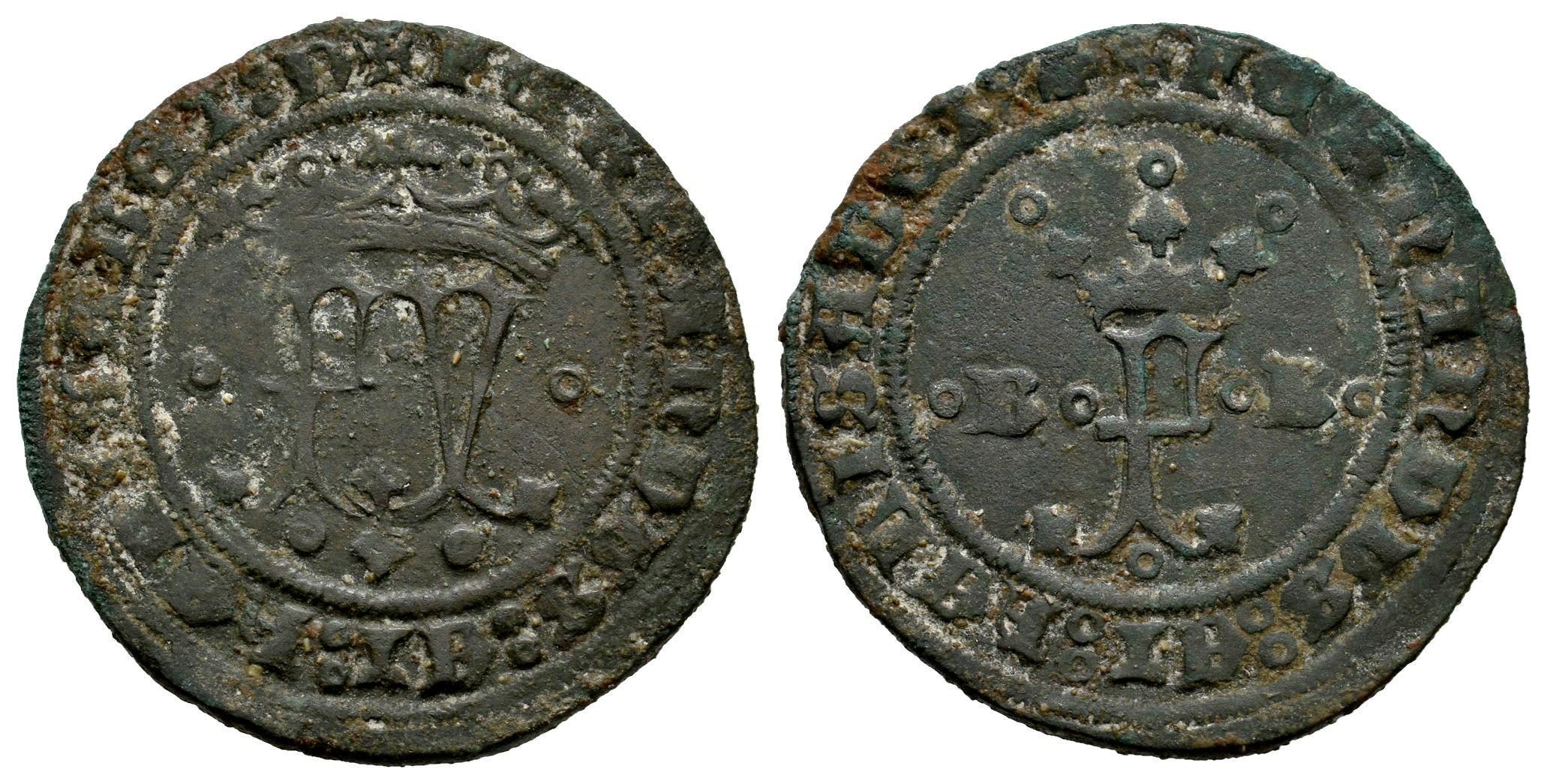 Catholic Kings (1474-1504). 2 maravedis. ND. Burgos. (Cal-70). Ae. 3,22 g. Eagle's head at the end of the legend on reverse. Struck for Santo Domingo. Very rare. Choice VF. Est...1200,00.