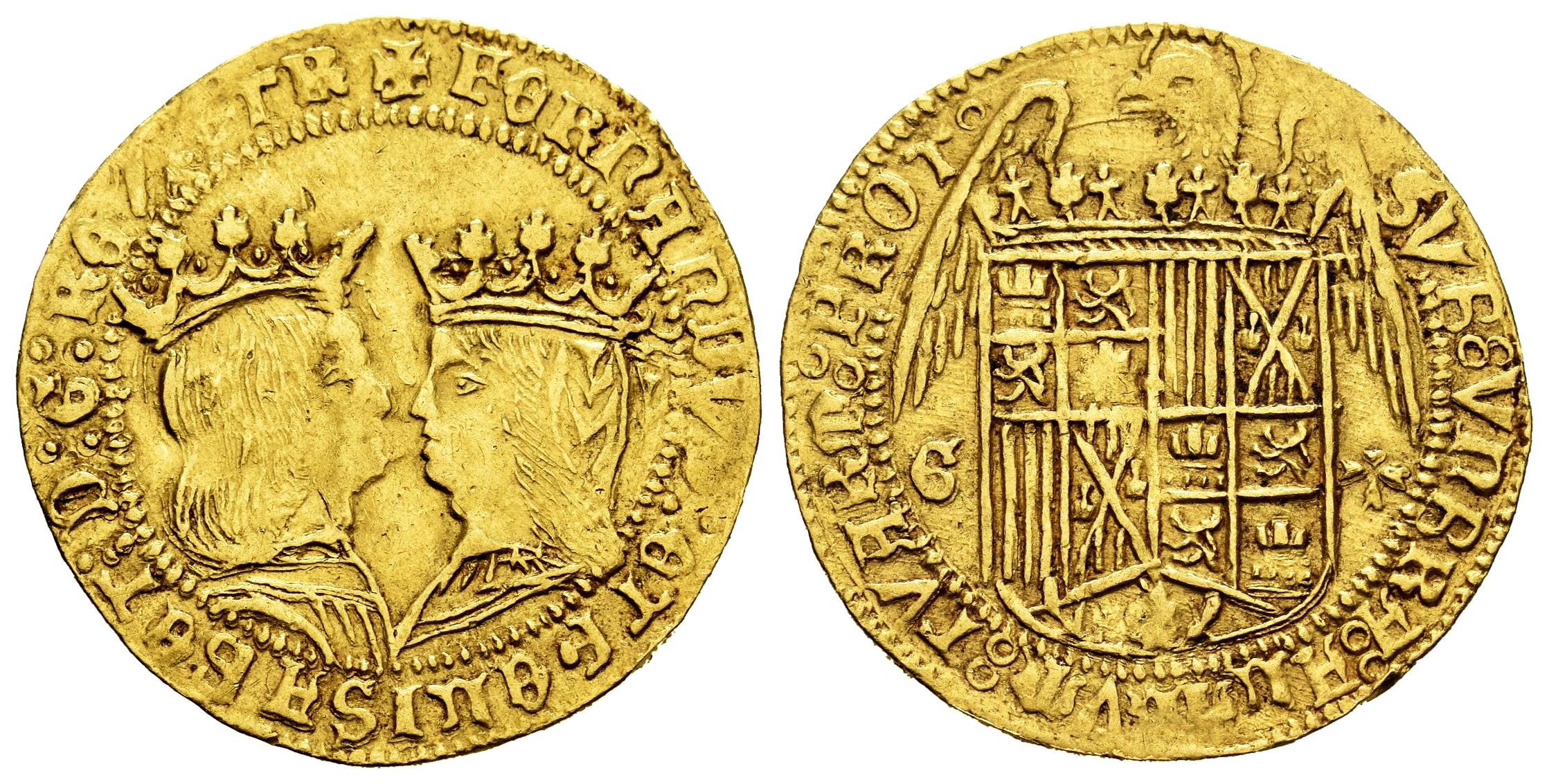 Catholic Kings (1474-1504). Double excelente. Granada. (Cal-707). Anv.: + FERNANDVS : ETh : ELISABET : D : G : REX : ET R. Rev.: SVB : VNBRA : ALARVM : TVARM : PROT ·. Au. 6,94 g. Shield between G and cruciform ornament. Small edge nock. Nice color. Rare. Almost XF. Est...5000,00.
