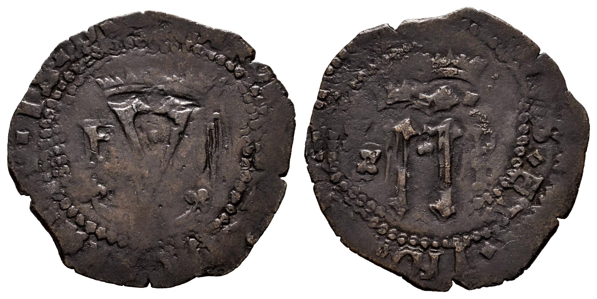 Charles-Joanna (1504-1555). 2 maravedis. ND (ca. 1542). Santo Domingo. F/S-P. (Cal-17). Anv.: Crowned Y with inner dot, between F-II. Rev.: Crowned I-I between S-P and central dot. Ae. 1,46 g.