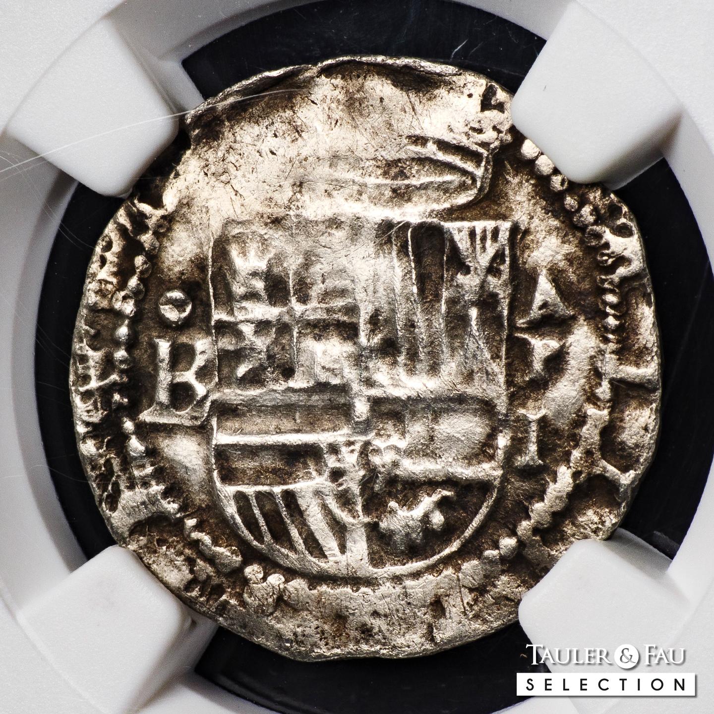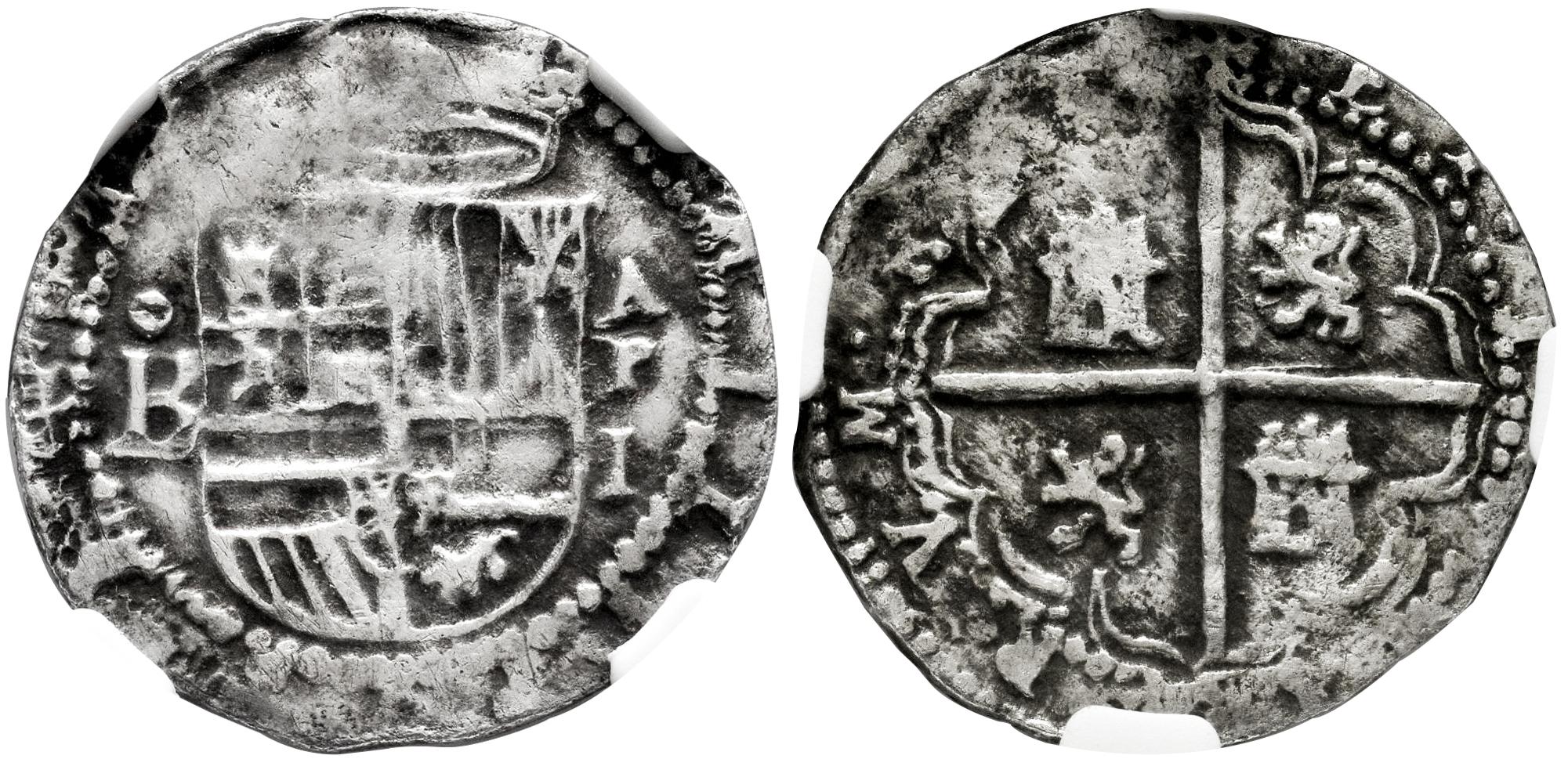Philip II (1556-1598). 1 real. ND (1582-1583). Panama. (Proctor-1R.5B). (Cal-236). . 3,34 g. Shield flanked by oB to the left, with the AP mintmark positioned above the denomination I to the right. A remarkably well-struck specimen for a series renowned for its notably crude fabric: both the shield and cross are complete, and portions of the legend remain legible. A piece that will undoubtedly appeal to collectors of this period and represents an exceptional opportunity to acquire a type that rarely appears on the market. Extremely rare. Certified by NGC as XF Details, Environmental Damage. Only three examples are recorded in the NGC census. In 1579, Philip II authorized the minting of silver coinage in the city of Panama, establishing standards for its composition and design, including the use of the PA mintmark with the superimposed A. Although documentation concerning this mint surfaced in 1952, its existence remained virtually unrecognized by the numismatic community for decades. Recent research by J. Proctor has confirmed that the mint operated between 1580 and 1583, and that the cob issues featuring a crowned shield and the A over P mintmark indeed correspond to its output. These emissions are of extraordinary rarity, with very few specimens known across all varieties. The identity of the assayers is not definitively documented, although it has been suggested that Bernardino Rodríguez may have served in this capacity between 1582 and 1583. Est...9000,00.