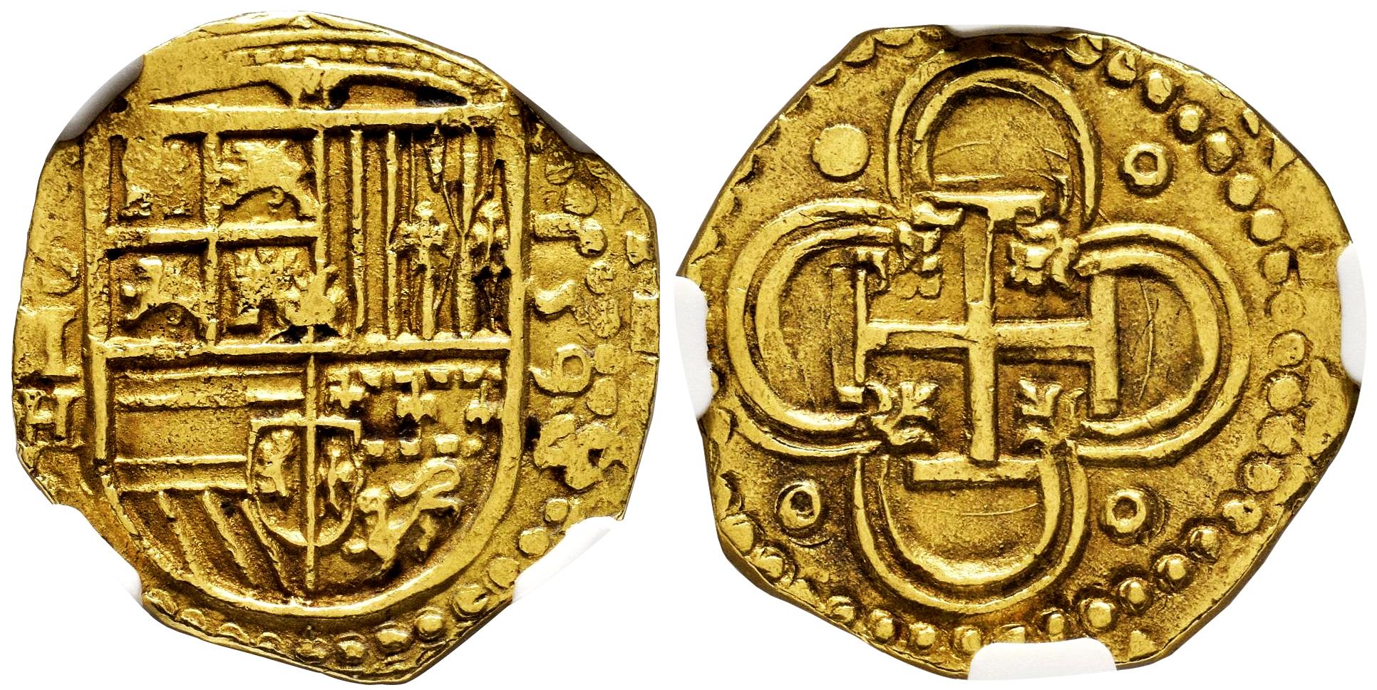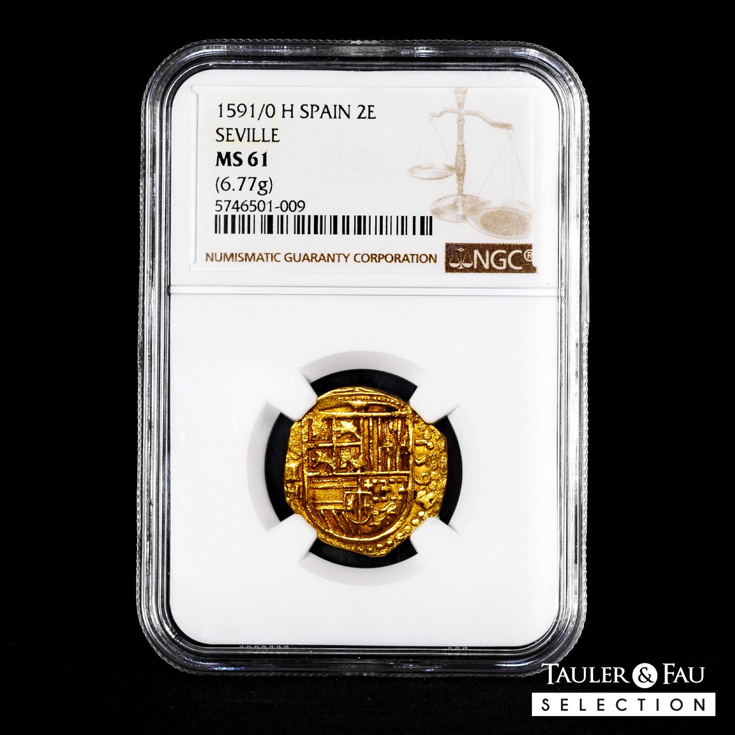 Philip II (1556-1598). 2 escudos. 1591/0. Sevilla. H. (Cal-839). (Tauler-43). (Fried-169). Au. 6,77 g. Overdate. Bold strike with all visible data. Very nice color. Rare, even more so in this grade. Slabbed by NGC as MS 61. Only 2 finer specimens in the NGC census. Est...3000,00.