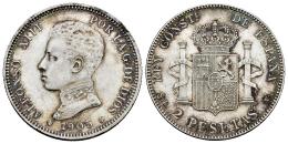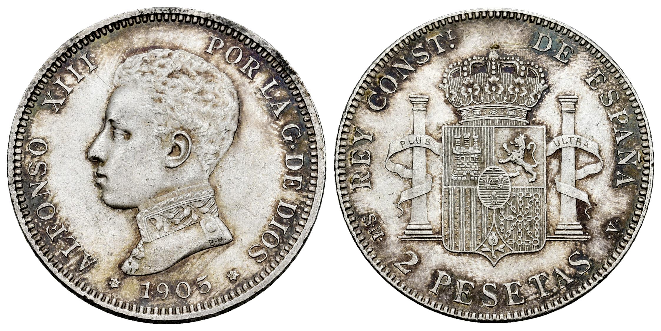 Centenary of the Peseta (1868-1931). Alfonso XIII (1886-1931). 2 pesetas. 1905*19-05. Madrid. SMV. (Cal-88). Ag. 9,98 g. Minimal hairlines. Traces of luster. Toned. XF. Est...30,00.
