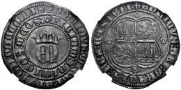 Kingdom of Castille and Leon. Enrique II (1368-1379). 1 real. Sevilla. (Bautista-553). Anv.: + DOMINVS : MIChI : AIVTOR : ED EGO : DIS / (8-petal flower) PICIAM : INIMICOS : MEOS :. Rev.: + ENRICVS : DEI : GRACIA : REX : CASTELL. Ag. 3,46 g. Roses at the ends of the axes and S at the lower end of the vertical axis. Nice old cabinet tone. Slabbed by NGC as AU 58. Est...350,00.