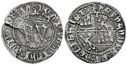 Catholic Kings (1474-1504). 1/2 real. Toledo. (Cal-273 var.). (Bautista-Unlisted). Anv.: .·. DOMINVS : MIChI : ADIV : . F .·. Y crowned. Rev.: + FERNANDVS : ET : hELISRBET : . Pellets at the ends of the axes. Ag. 1,64 g. Before the Pragmatica. The A in "hELISABET" is an R. T on the upper side of the vertical axis. Flan cracks. Rare. Almost VF/VF. Est...500,00.