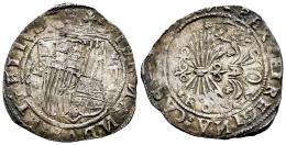Catholic Kings (1474-1504). 2 reales. Granada. R. (Cal-498). Ag. 6,82 g. G-II flanking the shield, G on reverse. Floral ornaments flanking mintmark and value, separating the legends, and decorating the reverse field. Double striking on obverse. Nearly full legends with inverted N’s. Scarce. Choice VF. Est...160,00.