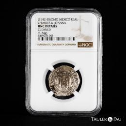 Charles-Joanna (1504-1555). 1 real. ND (1554-1556). Mexico. O. (Cal-74). Ag. 3,24 g. Nice strike with virtually full legends. Slabbed by NGC as UNC Details, Cleaned. Est...450,00.