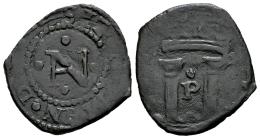 Charles I (1516-1556). Cornado. ND. Pamplona. (Cal-43 var.). (Ros-4.2.13 var.). Rev.: : SIT · NOMEN · D ... NAV monogram acoted by 4 roundels. Ae. 1,17 g. A very rare variant of the central "N" on the reverse. Reference catalogs have always classified it as a simple "N," but this example features a horizontal crossbar forming an A, resulting in a "NAV" monogram. Very rare and apparently unpublished. Choice VF/Almost VF. Est...100,00.